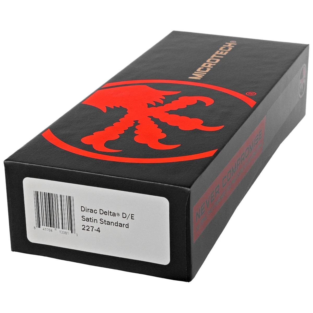 Dirac Delta D/E Black Aluminum, Satin is an enlarged OTF automatic knife from the Dirac series. Operating in D/A mode, it features a hellishly fast blade extension mechanism. Slider button on the side of the handle. 100% made and assembled in the USA. Designed by Anthony Marfione, knifemaker and owner of Microtech Knives.