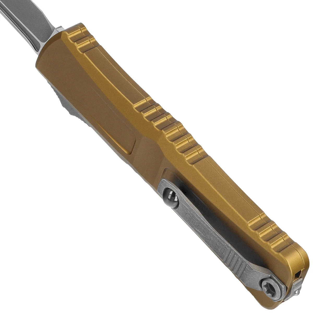 Combat Troodon Gen III T/E Tan Aluminum, Apocalyptic this largest of the automatic knives is the pinnacle of precision engineering and tactical prowess in the field of OTF (Out The Front) knives. Built for a wide range of utility applications, it boasts a 25% larger size compared to the flagship Troodon. Precisely crafted, it features a sophisticated and hellishly fast mechanism that extends the razor-sharp blade. 100% made and assembled in the USA. Designed by Anthony Marfione, knifemaker and owner of Microtech Knives.