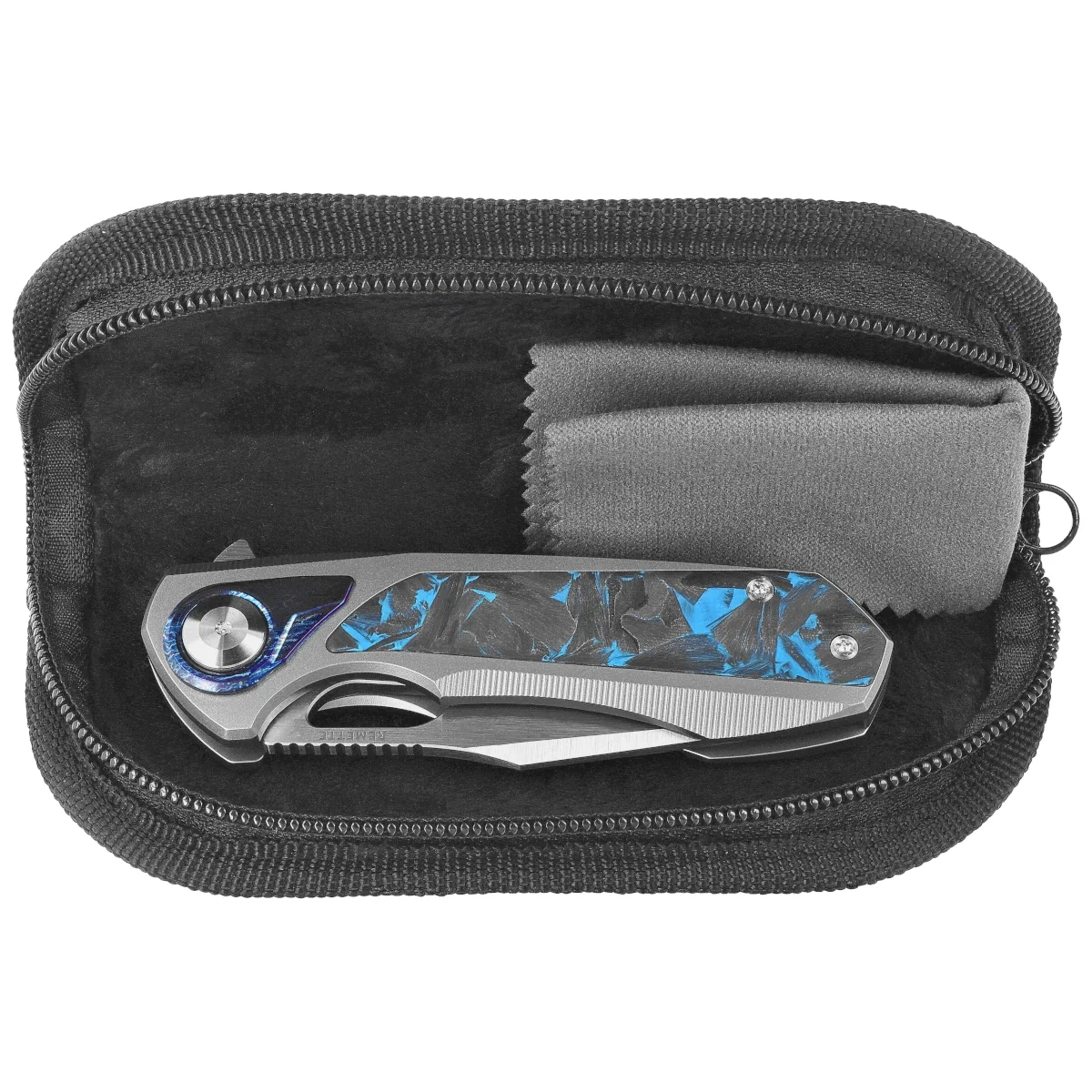Handle - titanium body is reinforced with elegant carbon fiber two-tone inlays , which affect both the visual balance of the design, as well as the ergonomics of the grip. The milling used improves traction and increases the knife's handling comfort, while the beveled edges make it easier to maneuver the tool at different grip angles. The button frame lock works smoothly, with a noticeable ratcheting point, ensuring safety and speed of operation. Complementing the design is a deep carry clip, which allows for low-profile, discreet carrying of the folder.
