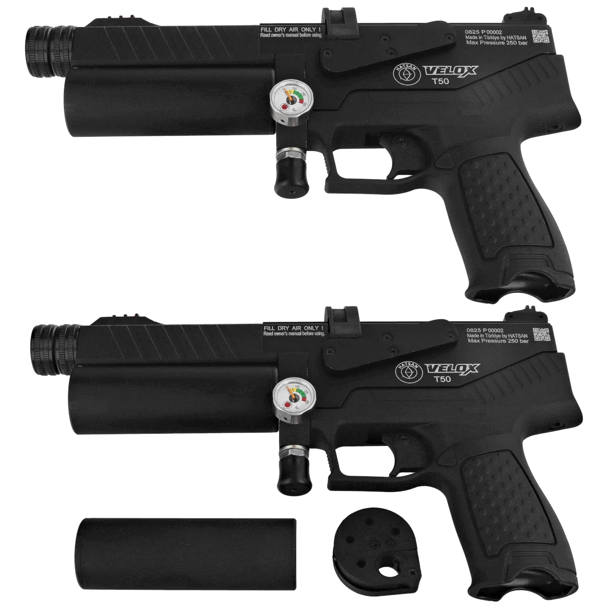 Powered - by compressed air from an aluminium pressure air tank located under the barrel with a capacity of 55 cc, filled to 250 bar. A fully charged air cylinder provides about 20 effective shots. The Velox T50 pistol's air cylinder unscrews, allowing for quick replacement of an empty tank with a full one and continued shooting. The set includes two replaceable air tanks. A pressure gauge allows for ongoing monitoring of the tank pressure and its charge level.