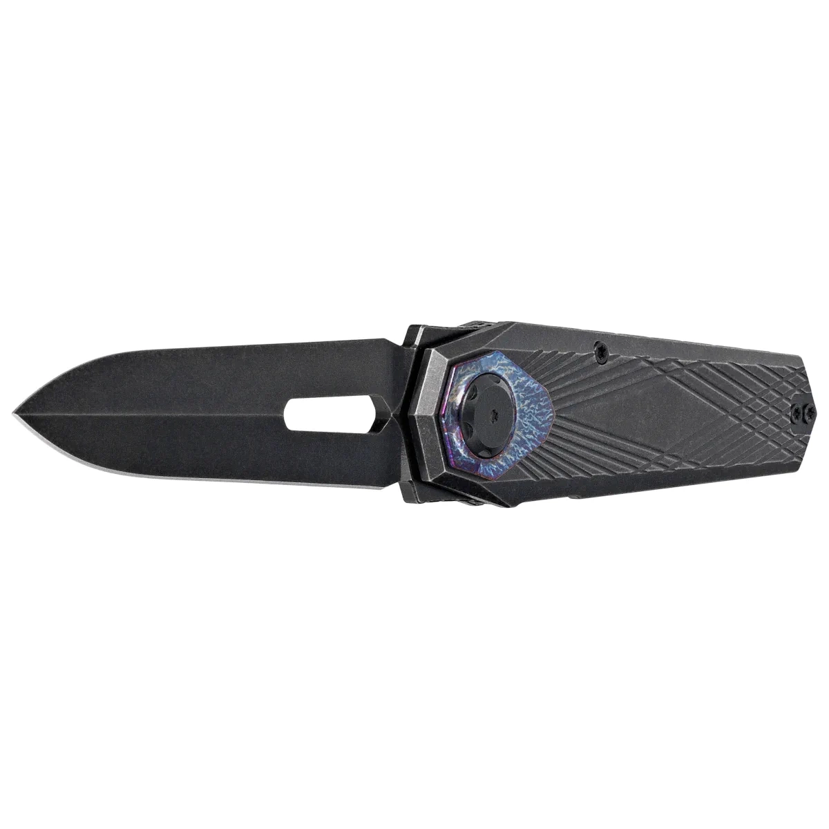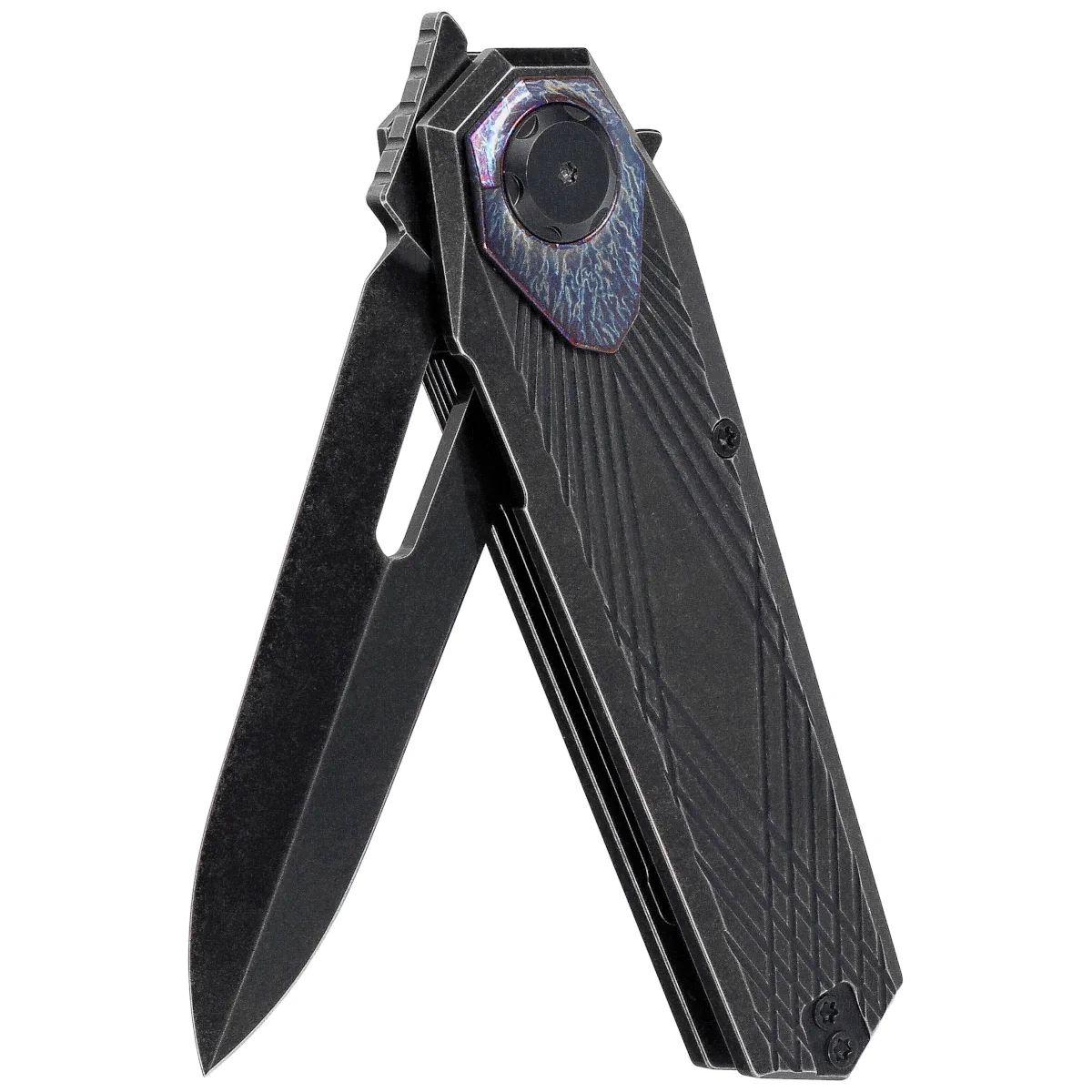 Handle - made of titanium 6AL-4V is distinguished by its minimalist design and balanced construction, providing ergonomics, durability and low weight. The milled lines increase grip and add technical character, while the precisely rounded edges take care of grip comfort. A decorative inlay around the pivot highlights the workmanship detail, combining aesthetic value with custom design symbolism. The button liner lock guarantees rigidity and safety in use, while the deep carry clip allows you to carry the knife comfortably in your pocket. There is also a lanyard hole on the back of the backspacer - a practical element for increased portability and personalization.