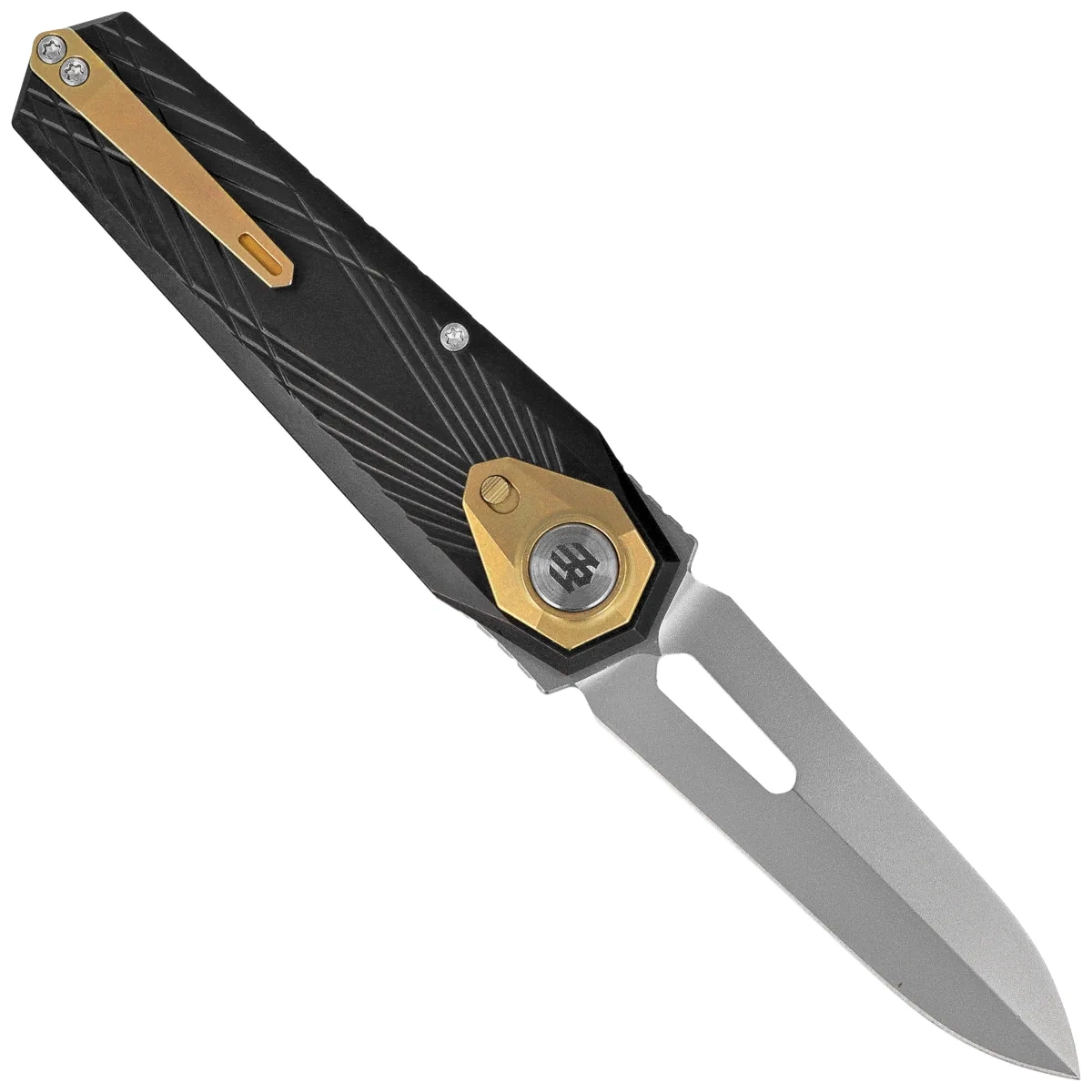 Handle - made of titanium 6AL-4V is distinguished by its minimalist design and balanced construction, providing ergonomics, durability and low weight. The milled lines increase grip and add technical character, while the precisely rounded edges take care of grip comfort. A decorative inlay around the pivot highlights the workmanship detail, combining aesthetic value with custom design symbolism. The button liner lock guarantees rigidity and safety in use, while the deep carry clip allows you to carry the knife comfortably in your pocket. There is also a lanyard hole on the back of the backspacer - a practical element for increased portability and personalization.