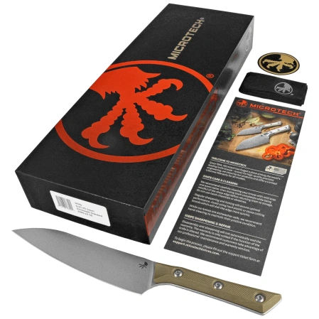 Utility OD Green G10, Stonewashed is a modern interpretation of the traditional kitchen knife by one of America's most respected knife brands. Created in the spirit of technical perfection and utilitarian minimalism, it is the perfect tool for professional chefs and enthusiasts of precision cutting. The traditional silhouette is enhanced here with high-end materials and ergonomics refined to perfection. Blade made of advanced M390MK steel offers excellent sharpness retention, full corrosion resistance and microstructure stability, even under heavy use. Its stonewashed finish gives the surface a matte texture that effectively masks traces of use and adds a professional, working character to the blade . The all-purpose profile makes the knife successfully perform the tasks of portioning, slicing and chopping, while maintaining smooth operation and precise blade guidance. The handle is made of durable G10 composite, a material resistant to moisture, temperature and mechanical factors. Subtle milling improves the grip, and the minimalist geometry of the handle provides stable support for the hand - regardless of the intensity of work. Mounting elements in the form of torx screws increase the rigidity of the design and allow easy disassembly for maintenance. Thanks to a perfectly balanced combination of ergonomics, durability and modern design, the Utility model from Microtech is perfect both in the professional kitchen and in the hands of the home user who does not compromise on quality. The included protective blade sheath allows for safe storage and transportation. This is a knife that not only meets expectations - he redefines them.