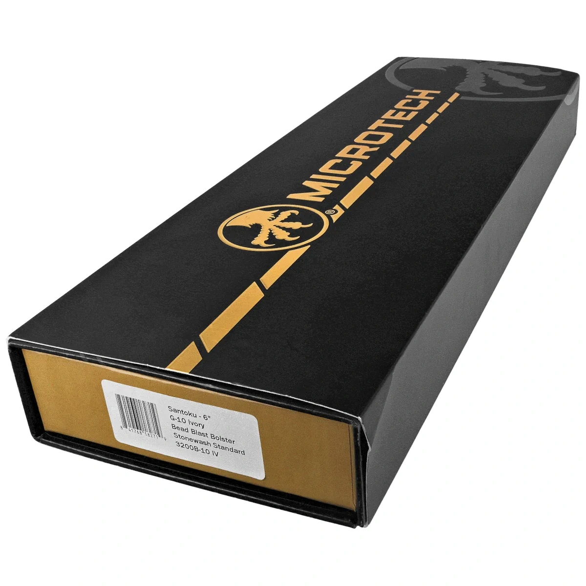 Santoku 6" Titanium Bolster/Ivory G10, Stonewashed is a modern interpretation of the traditional kitchen knife by one of America's most respected knife brands. Created in the spirit of technical perfection and utilitarian minimalism, it is the perfect tool for professional chefs and enthusiasts of precision cutting. The distinctive santoku silhouette is enhanced here with high-end materials and ergonomics refined to perfection. Blade made of advanced M390MK steel offers excellent sharpness retention, full corrosion resistance and microstructure stability, even under heavy use. Its stonewashed finish gives the surface a matte texture that effectively masks traces of use and adds a professional, working character to the blade . The santoku profile makes the knife successfully perform the tasks of portioning, slicing and chopping, while maintaining the smoothness of work and precision of the blade. The handle is made of titanium and durable G10 composite, a material resistant to moisture, temperature and mechanical factors. Subtle milling improves the grip, and the minimalist geometry of the handle provides stable support for the hand - regardless of the intensity of work. Mounting elements in the form of torx screws increase the rigidity of the design and allow easy disassembly for maintenance. Thanks to the perfectly balanced combination of ergonomics, durability and modern design, the Santoku model from Microtech is perfect both in the professional kitchen and in the hands of the home user who does not consider compromising on quality. The included protective blade guard allows for safe storage and transportation. This is a knife that not only meets expectations - he redefines them.