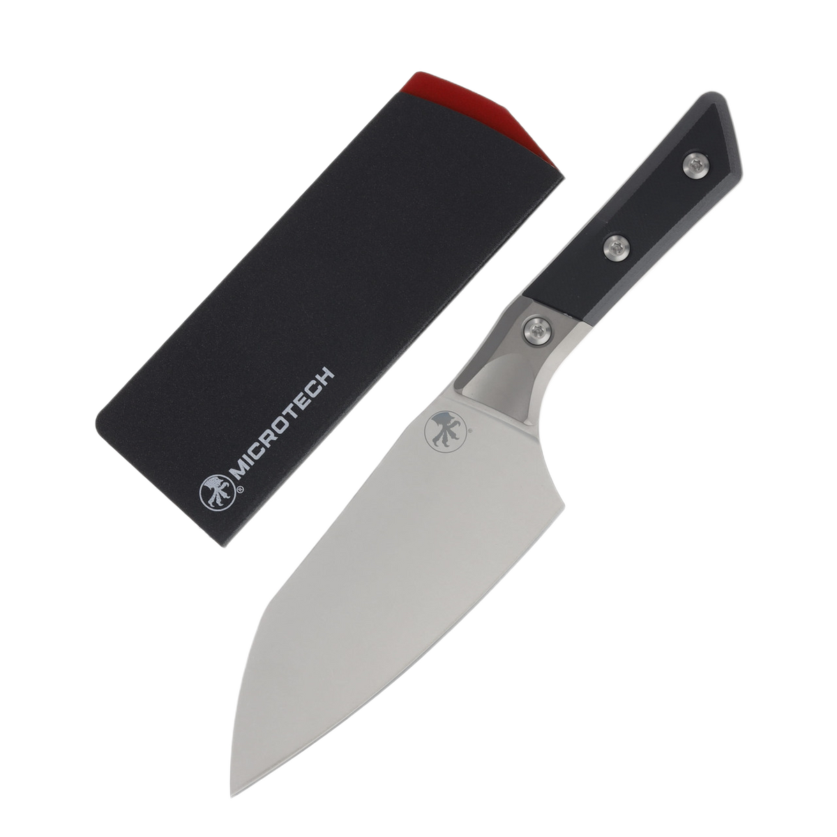 0,00 €Santoku 6" Titanium Bolster/Black G10, Stonewashed is a modern interpretation of the traditional kitchen knife by one of America's most respected knife brands. Created in the spirit of technical perfection and utilitarian minimalism, it is the perfect tool for professional chefs and enthusiasts of precision cutting. The distinctive santoku silhouette is enhanced here with high-end materials and ergonomics refined to perfection. Blade made of advanced M390MK steel offers excellent sharpness retention, full corrosion resistance and microstructure stability, even under heavy use. Its stonewashed finish gives the surface a matte texture that effectively masks traces of use and adds a professional, working character to the blade . The santoku profile makes the knife successfully perform the tasks of portioning, slicing and chopping, while maintaining the smoothness of work and precision of the blade. The handle is made of titanium and durable G10 composite, a material resistant to moisture, temperature and mechanical factors. Subtle milling improves the grip, and the minimalist geometry of the handle provides stable support for the hand - regardless of the intensity of work. Mounting elements in the form of torx screws increase the rigidity of the design and allow easy disassembly for maintenance. Thanks to the perfectly balanced combination of ergonomics, durability and modern design, the Santoku model from Microtech is perfect both in the professional kitchen and in the hands of the home user who does not consider compromising on quality. The included protective blade guard allows for safe storage and transportation. This is a knife that not only meets expectations - he redefines them.