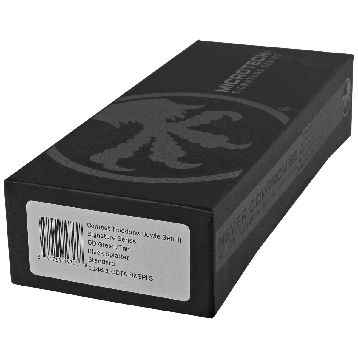 Combat Troodon Gen III Bowie Signature OD Green/Tan W/Black Splatter Aluminum, OD Green/Tan W/Black Splatter this largest of the automatic knives, is the pinnacle of precision engineering and tactical prowess in the field of OTF (Out The Front) knives. Built for a wide range of utility applications, it boasts a 25% larger size compared to the flagship Troodon. Precisely crafted, it features a sophisticated and hellishly fast mechanism that extends the razor-sharp blade. 100% made and assembled in the USA. Designed by Anthony Marfione, knifemaker and owner of Microtech Knives.