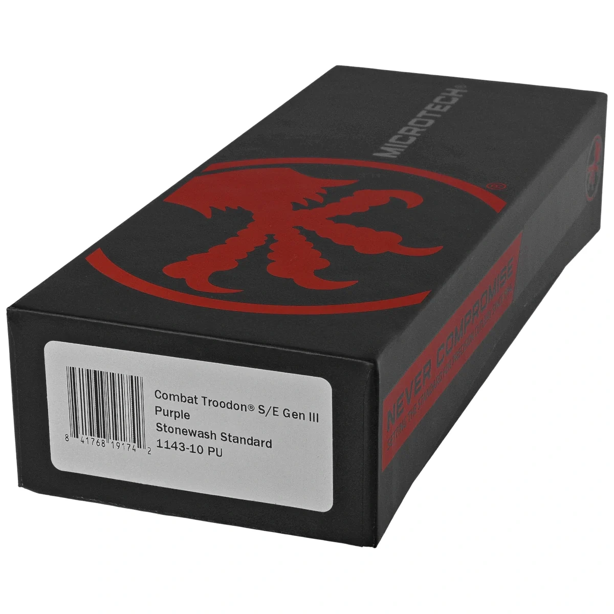 Combat Troodon Gen III S/E Purple Aluminum, Stonewashed this largest of the automatic knives is the pinnacle of precision engineering and tactical prowess in the field of OTF (Out The Front) knives. Built for a wide range of utility applications, it boasts a 25% larger size compared to the flagship Troodon. Precisely crafted, it features a sophisticated and hellishly fast mechanism that extends the razor-sharp blade. 100% made and assembled in the USA. Designed by Anthony Marfione, knifemaker and owner of Microtech Knives.