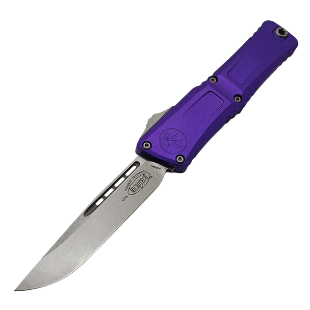 Combat Troodon Gen III S/E Purple Aluminum, Stonewashed this largest of the automatic knives is the pinnacle of precision engineering and tactical prowess in the field of OTF (Out The Front) knives. Built for a wide range of utility applications, it boasts a 25% larger size compared to the flagship Troodon. Precisely crafted, it features a sophisticated and hellishly fast mechanism that extends the razor-sharp blade. 100% made and assembled in the USA. Designed by Anthony Marfione, knifemaker and owner of Microtech Knives.