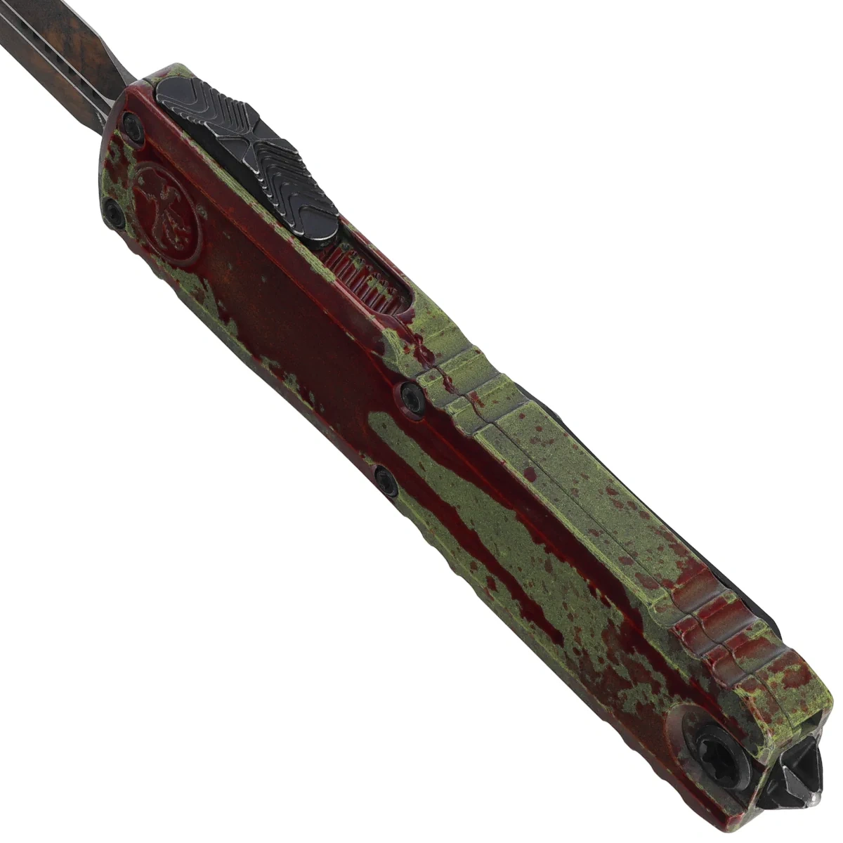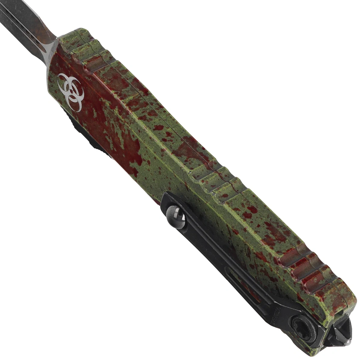 Ultratech D/E Gen III ZBP Signature Outbreak Aluminum, Outbreak is a new addition to the Ultratech series - Microtech's first OTF knife without any blade play when unfolded! The model is distinguished by a unique “Outbreak” finish in green with red splashes (“blood splatter”) and a deeply engraved Biohazard symbol , being the hallmark of the series. The blade play free automatic is distinguished by a number of improvements, such as; Crud Kutter™, Dual-Fuel Drive Train™, Zero Blade Play™. The Handle was also redesigned, equipping it with solutions known from other models. Working in D/A (Double Action) mode, it allows the blade to be instantly extended and retracted with a single thumb movement. The design by Tony Marfione, owner of Microtech Knives, combines modern design with the highest quality workmanship