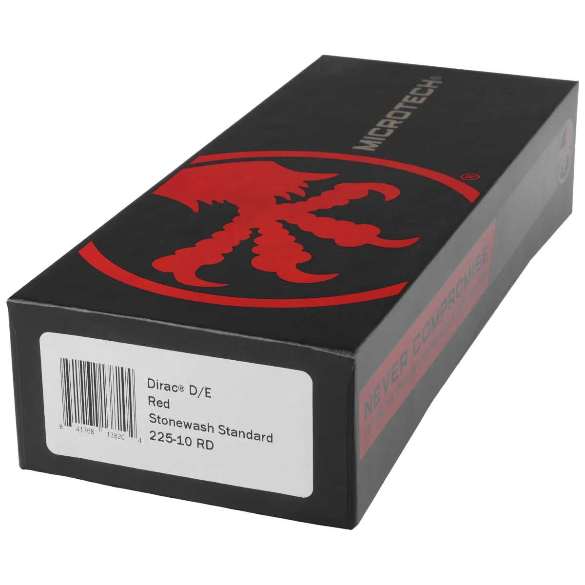 - Dirac D/E Red Aluminum, Stonewashed is a compact OTF automatic knife from the Dirac series. Operating in D/A mode, it features a hell of a fast blade extension mechanism. Slider button on the side of the handle. Designed by Tony Marfione of Microtech.