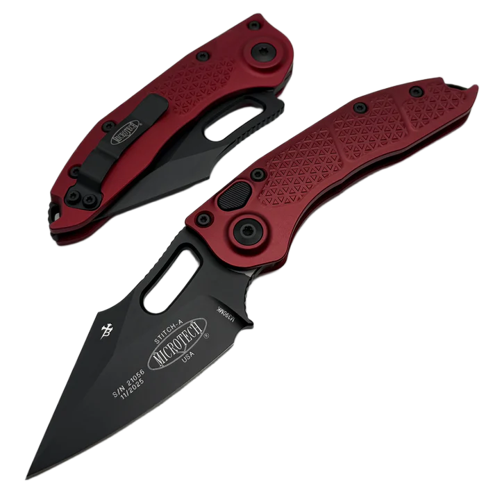 - Stitch-A S/E Tactical Merlot Aluminum, Black automatic version of the popular design by Sebastijan Berenjie of Borka Blades and Microtech. Wide harpoon-shaped blade, superior materials and legendary Microtech workmanship!