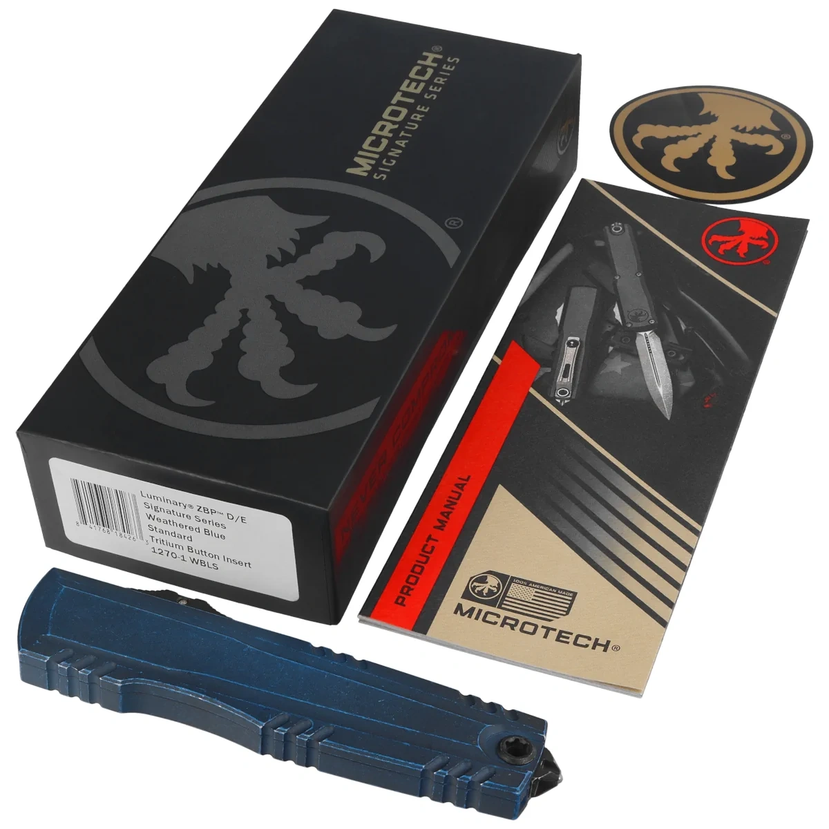 Microtech Luminary ZBP D/E Signature OTF Knife Weathered Blue Aluminum, Weathered Blue M390MK by Tony Marfione (1270-1WBLS)