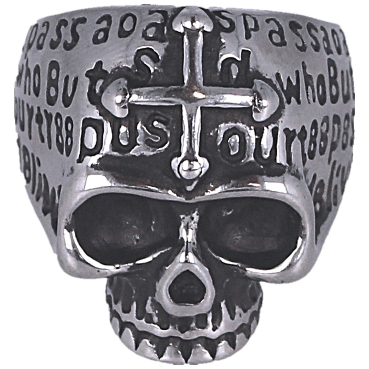 • Skull Cross Ring Ø21 (09984-21) - Gothic signet ring in the shape of a skull with a Templar cross on the forehead and ritual inscriptions. Made of hardy metal with a silver finish - for lovers of vanitas symbolism, memento mori and chivalric orders.