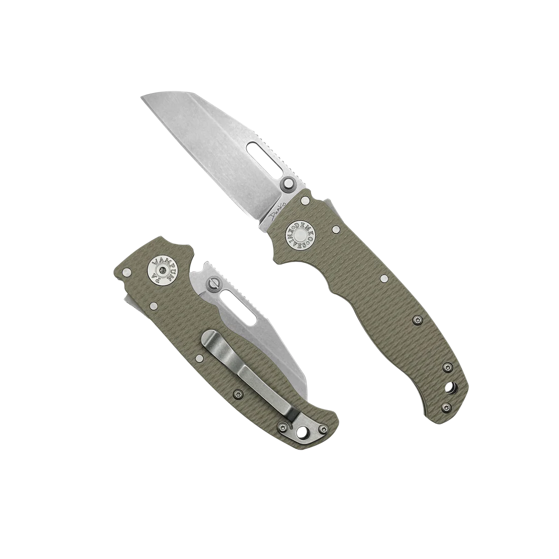 Handle grips - grips made of G10 composite , practically indestructible plastic insensitive to weather conditions, resistant to chemicals and mechanical damage. The chamfered edges of the covers eliminate sharp edges and the characteristic textured surface improves grip confidence. A single-position, right-handed clip allows the knife to be carried in the tip-up position , with the tip of the blade upward. A left-handed clip is included.