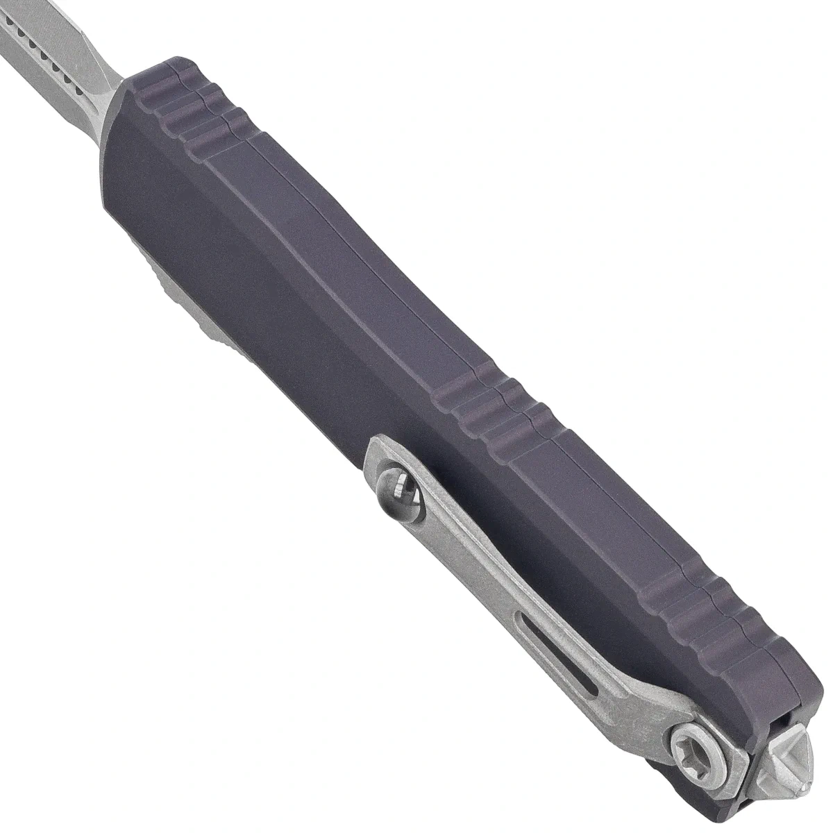 Handle - made with excellent precision in 3D technology on CNC milling machines, from Mil-Spec hard-coated aluminum 6061-T6. The surface texture of the Handle makes the knife non-slip in the hand during use. There are notches (jimping) on the back and bottom of the handle for a more secure grip. The slim profile and milled two-position (right/left) solid deep-carry clip allow the knife to be carried discreetly in a pocket, in tip-down (blade tip down) position. The clip bears the Microtech logo, serial number and production date. The Handle is finished with a glass breaker, a solid steel triangle into which a tungsten carbide ball has been pressed. It also features a hole for interweaving a decorative cord.
