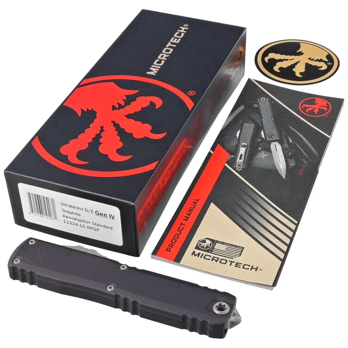 • Ultratech Gen IV D/E Graphite Aluminim, Apocalyptic is a full-size OTF automatic knife from Ultratech. Operating in D/A mode, Blade made of Böhler M390MK steel, precision machined aluminum Handle. Designed by Tony Marfione owner of Microtech