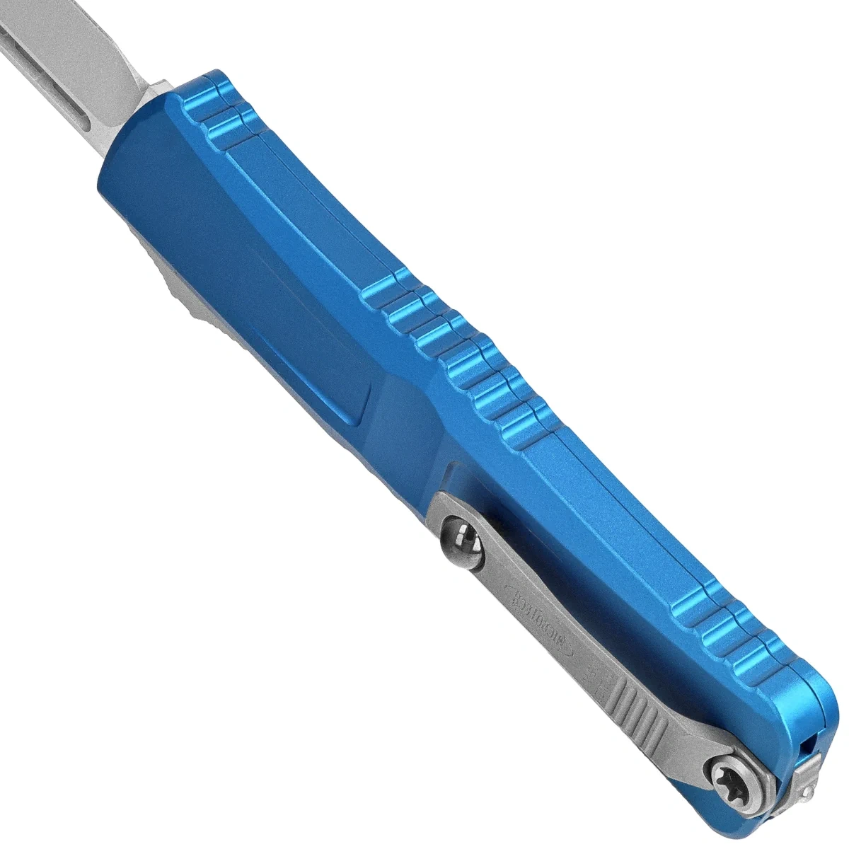 The clip bears the Microtech logo and production date. The Handle is finished with glass breaker, a steel triangle, into which a tungsten carbide ball has been pressed.