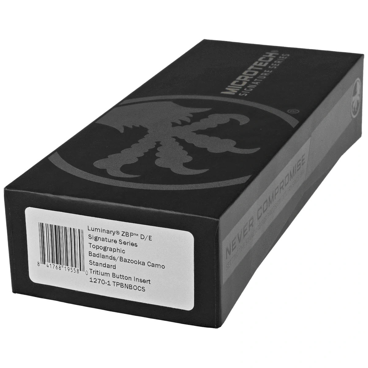 The Luminary ZBP D/E Signature Topographic Badlands/Bazooka Camo Aluminum, Topographic Badlands/Bazooka Cam o is a full-size OTF(Out The Front) automatic knife from the prestigious Signature Series line. The design is characterized by the absolute absence of any blade play when unfolded - full rigidity and confidence in the mechanism. The blade machine “blade play free” is distinguished by a number of improvements such as; Crud Kutter™, Dual-Fuel Drive Train™, Zero Blade Play™. Operating in D/A (Double Action) mode, it allows the blade to be instantly extended and retracted with a flick of the thumb, guaranteeing unparalleled speed and reliability in situations requiring immediate response. The proprietary design by Tony Marfione, founder and owner of Microtech Knives, combines modern design with the highest quality workmanship to create a unique model valued by collectors and professional users alike.