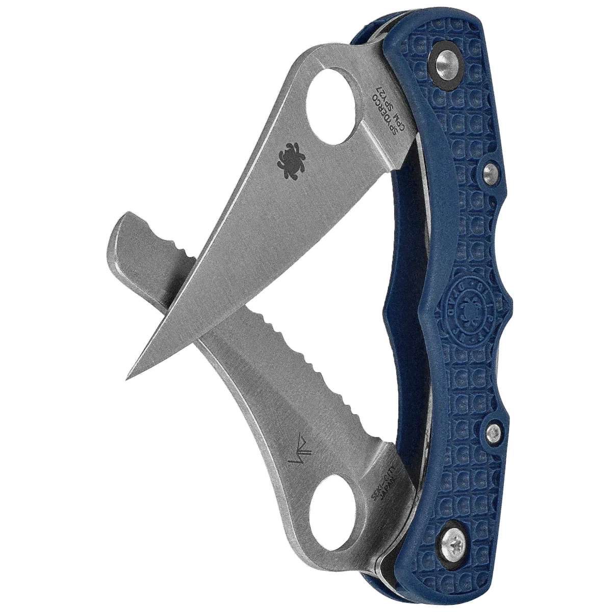 Handle - made of FRN (fiberglass reinforced nylon) plastic in cobalt blue, a hallmark of the SPY27 line. The Volcano Grip™ structure provides high grip and grip security in all conditions - both with wet hands and with gloves. The ergonomics of the Handle allows comfortable operation of both Blades regardless of the grip, and the lightweight and compact form makes the knife fit well in your pocket - the model is designed for in-pocket carry, without a clip, which increases discretion and comfort in carrying. The use of bolt-on construction increases strength and precision of assembly - important for knives with dual mechanics. The Spyderco Dyad Jr. Lightweight is a combination of conceptual boldness, modern materials and limited uniqueness, aimed at people who expect more from an EDC than just a blade.