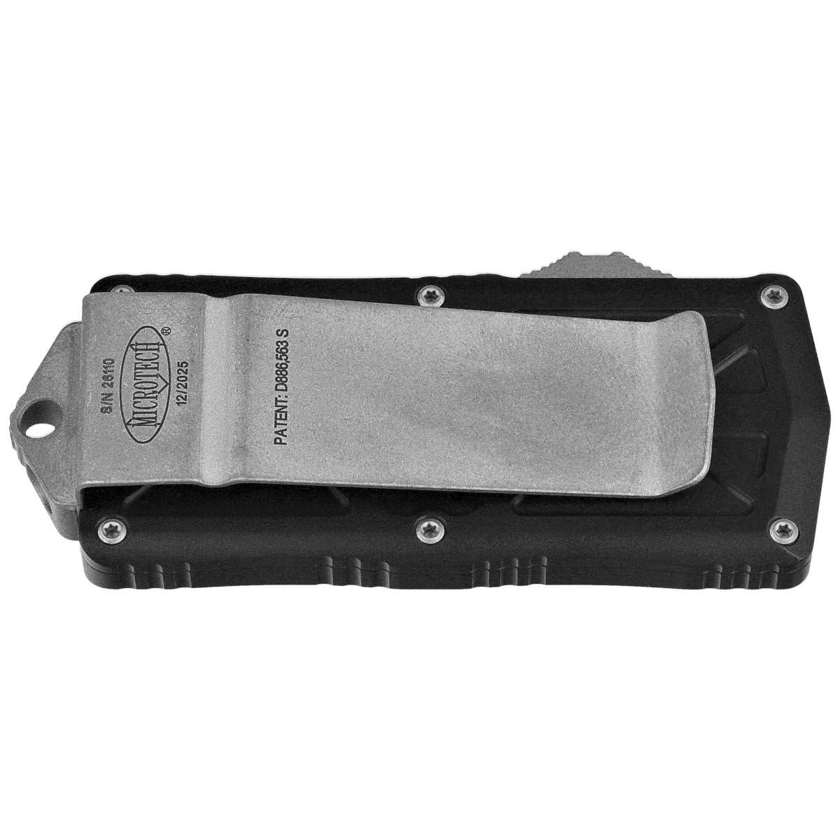Handle - made with excellent precision in 3D technology on CNC milling machines, from Mil-Spec coated 6061-T6 aluminum. There are notches (jimping) on the back and bottom of the Handle for a more secure grip. A two-position (right/left) solid deep-carry clip allows the knife to be carried discreetly in a pocket, in tip-down (blade tip down) position. The clip bears the Microtech logo and production date. Thanks to the large width of the clip, it can act as a clip for carrying cash! Handle is finished with glass breaker, solid steel triangle, with a hole for interweaving decorative cord.