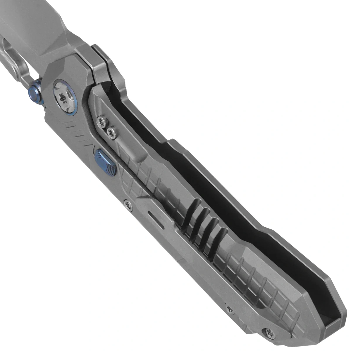 Handle - made of titanium, an integral part of the knife's construction, responsible for its rigidity, durability and grip security. Clearly marked edges, milled planes and regular surface texture improve the contact of the hand with the handle and reduce slippage, even during dynamic movements and prolonged use. The handle's profile promotes natural hand positioning, providing stability for both precision work and cuts requiring greater pressure. The design maintains a consistent balance between weight and control, which has a positive effect on the maneuverability of the knife in everyday use. The titanium clip used allows comfortable, discreet carrying and does not interfere with the ergonomics of the grip. The overall design creates a handle with an unmistakably technical character, designed for durability, reliability and comfort of long-term work.