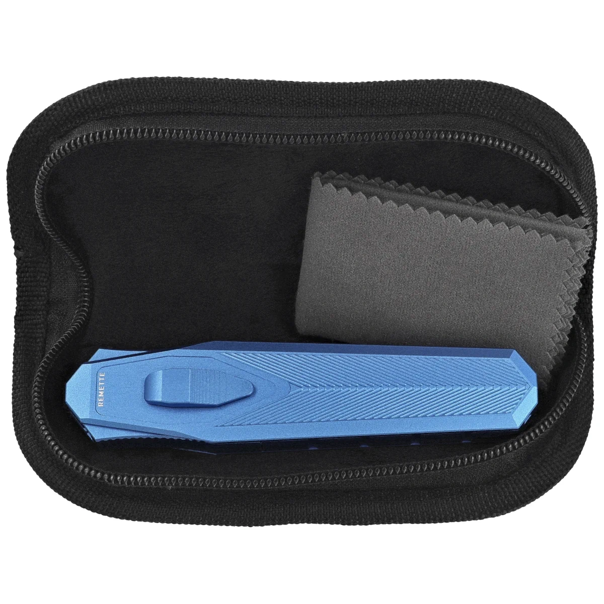 Swordfish T Blue Aluminum / Fat Carbon, Ceramic Sandblasted open intuitive, folding knife from the Remette Knives manufactory, a display of engineering in design. Gravity OTF (Out The Front), Blade extends from the front due to the force of gravity. Modeled on the design of the Luftwaffe gravity air knife, commonly known as the knife of German paratroopers. Intuitive blade ejection / retraction with one hand (under the influence of gravity) and excellent materials such as CPM S35VN blade steel and aluminum handle, perfectly combined with the unmatched quality of the Remette brand!