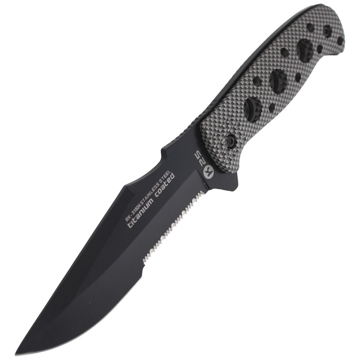 Rękojeść - okładziny z aluminium pokryto imitacją włókna węglowego (Carbon Fiber Look), powlekanego w wysokich temperaturach antypoślizgowym laminatem syntetycznej gumy (Rubber Coated). Dzięki zastosowanie kilku otworów na powierzchni okładek zredukowano wagę noża. Upper jimping teksturowane podparcie pod kciuk, a także single finger guard (stalowy jelec / osłona) chronią dłoń przed zsunięciem się na ostrze. W tylnej części okładzin lanyard hole, otwór na linkę.