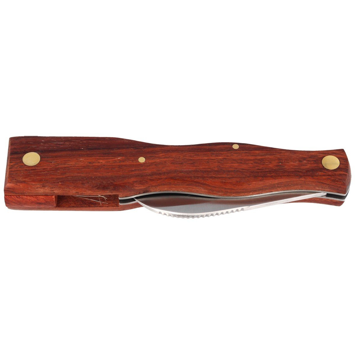 Rękojeść - pokryta profilowanymi okładzinami z barwionego drzewa. W tylnej części rękojeści znajduję się chowana szczotka do oczyszczania grzybów, Kompaktowe rozmiary (po złożeniu szczoteczki) umożliwiają łatwe przenoszenie noża w kieszeni. Nity wykonano z mosiądzu.