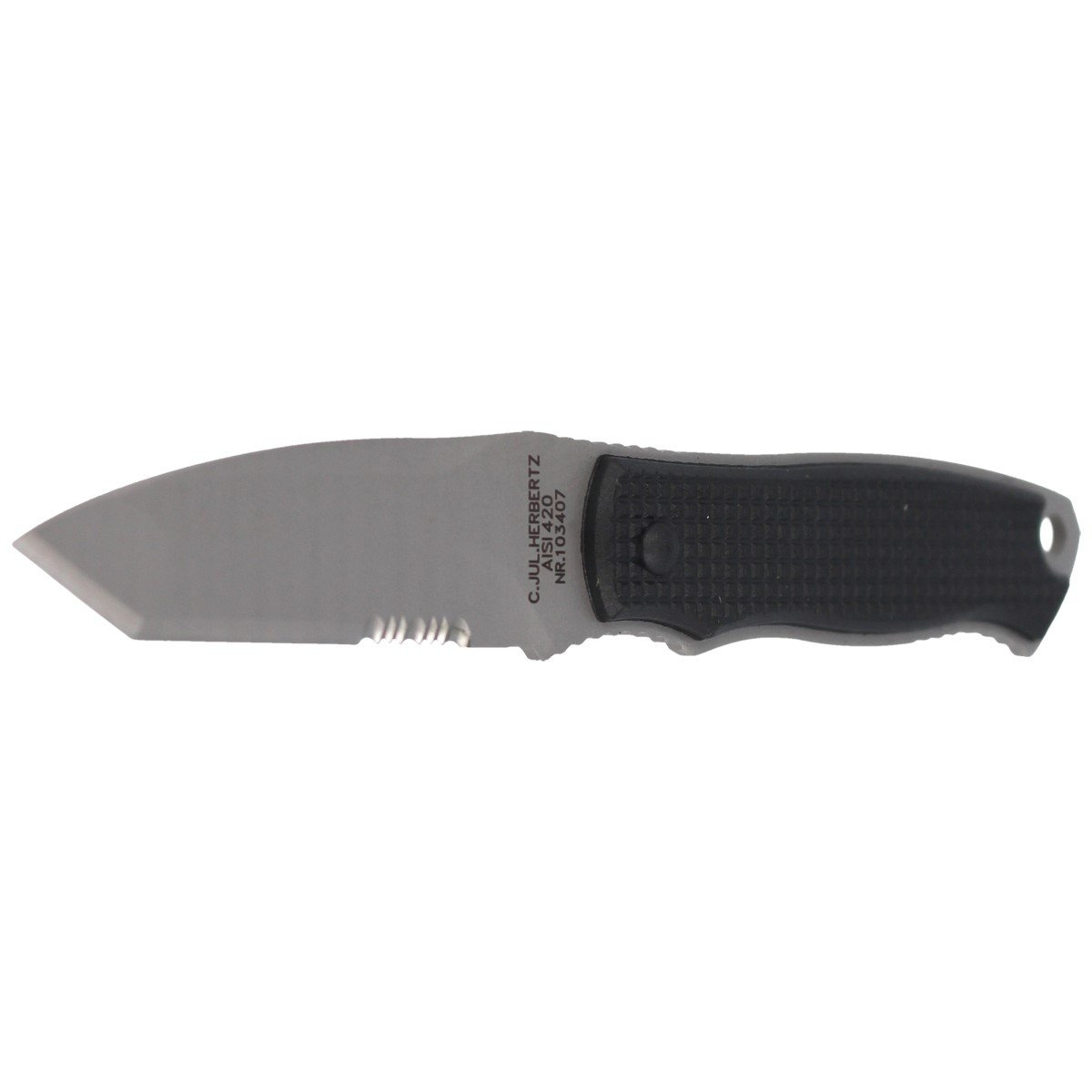 - Lekki 68 g nóż typu neck knife niemieckiej marki Herbertz Solingen o konstrukcji full tang z pochewką do zawieszania na szyi. Dzięki doskonałej ergonomii pewnie leży w dłoni mimo kompaktowych rozmiarów. Idealny nóż do samoobrony i na co dzień. Bestseller!