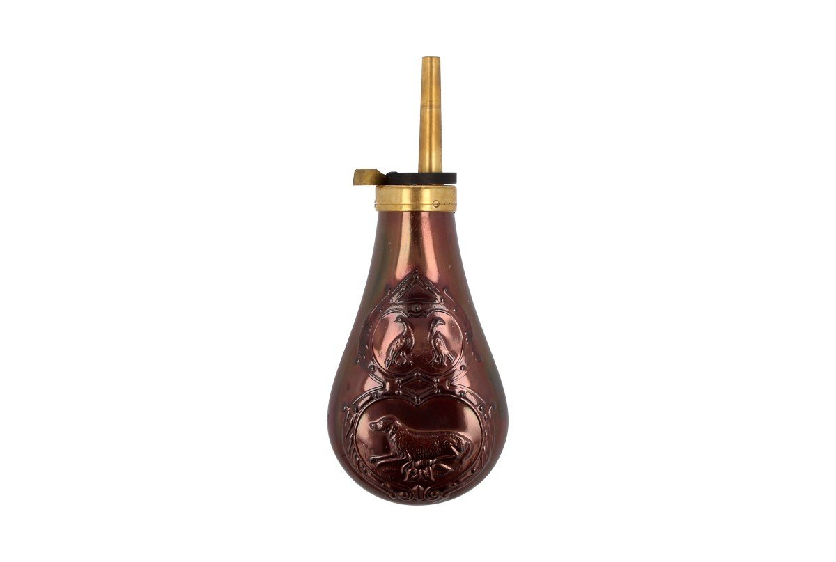 Remington Pattern Powder Flask .44 (030D529440) - prochownica z dozownikiem włoskiej firmy Davide Pedersoli. Zaprojektowana do rewolwerów czarnoporochowych Remington firmy Pietta i Uberti w kalibrze .44. Naważka prochu 24 grain. Prochownica z motywem myśliwskim przedstawiająca psa i 2 bażanty. Wykonana z lakierowanej miedzi oraz dozownikiem z mosiądzu.
