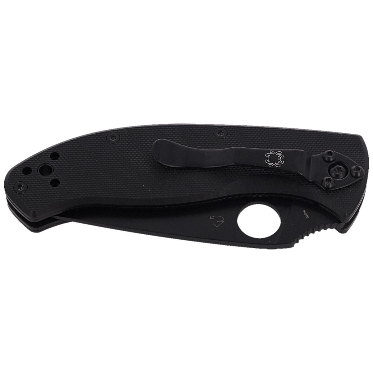 Głownia - o firmowym profilu Leaf-Shaped (kształt liścia), pokryta czarną powłoką. Ostrze Plain (gładkie) wyprowadzono szlifem pełnym płaskim (Full Flat Grind). Powiększone 14 mm okrągłe wycięcie SpyderHole (patent Spyderco) ułatwia otwarcie foldera zimnymi lub mokrymi dłońmi. Karbowany fragment grzbietu głowni, rampa (spine jimping) daje solidne podparcie dla kciuka co ułatwia operowanie nożem. Całość blokowana jest sprawdzoną blokadą Liner Lock.