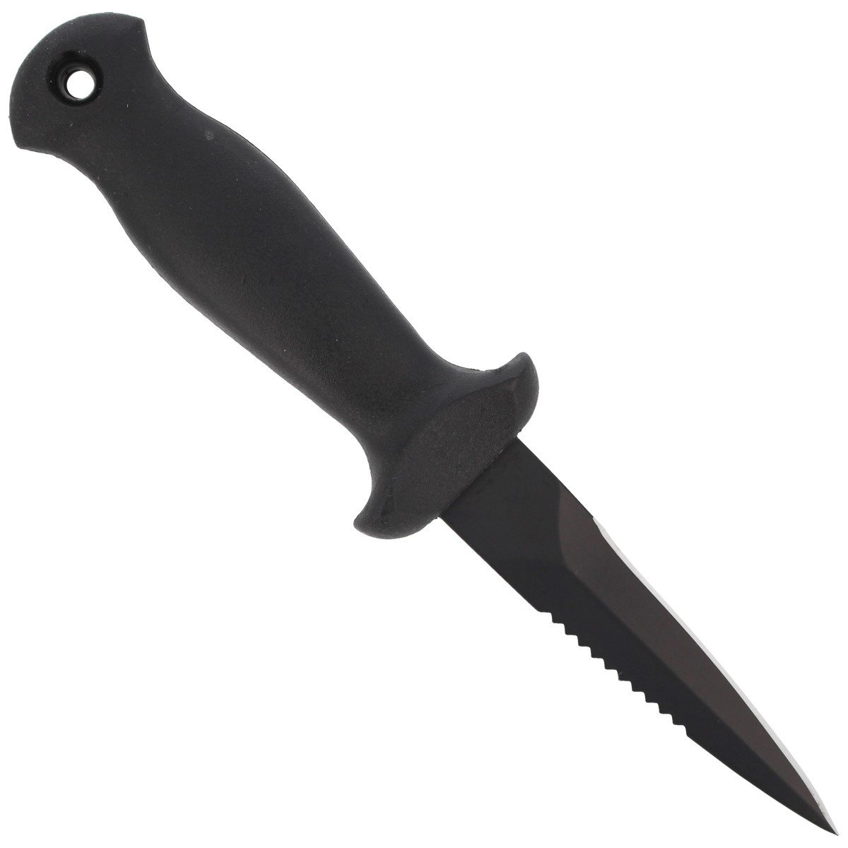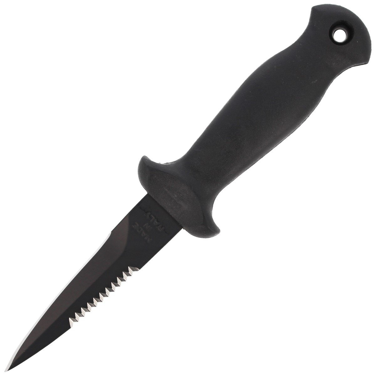 SUB 9 STILETTO BLACK 2 kompaktowy nóż dla nurka (back-up) o konstrukcji full tang ze stałą klingą pokrytą czarną matową powłoką Wyprodukowany przez włoską firmę MAC Coltellerie. Nadaje się do wykorzystania podczas wypraw nurkowych oraz na lądzie.