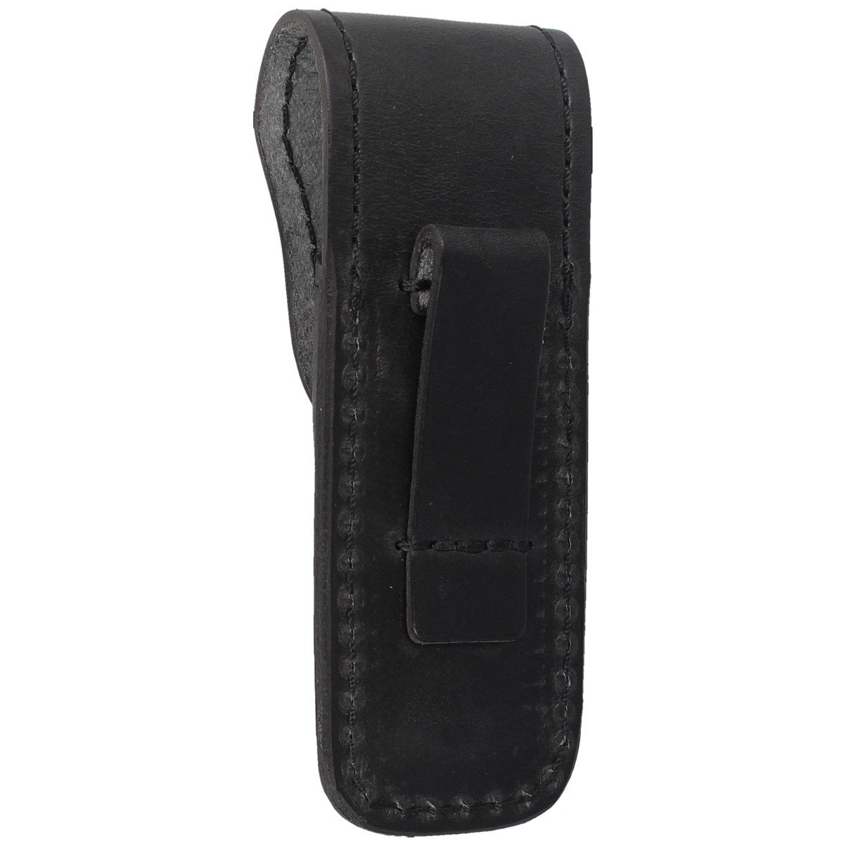 Etui - zapinane na zatrzask typu Prym. Wykonane z wysokiej jakości naturalnej skóry w kolorze czarnym z tłoczonym logo producenta. Pochwa posiada mocowanie do pasa lub oporządzenia umożliwiające przenoszenie noża w pozycji pionowej.