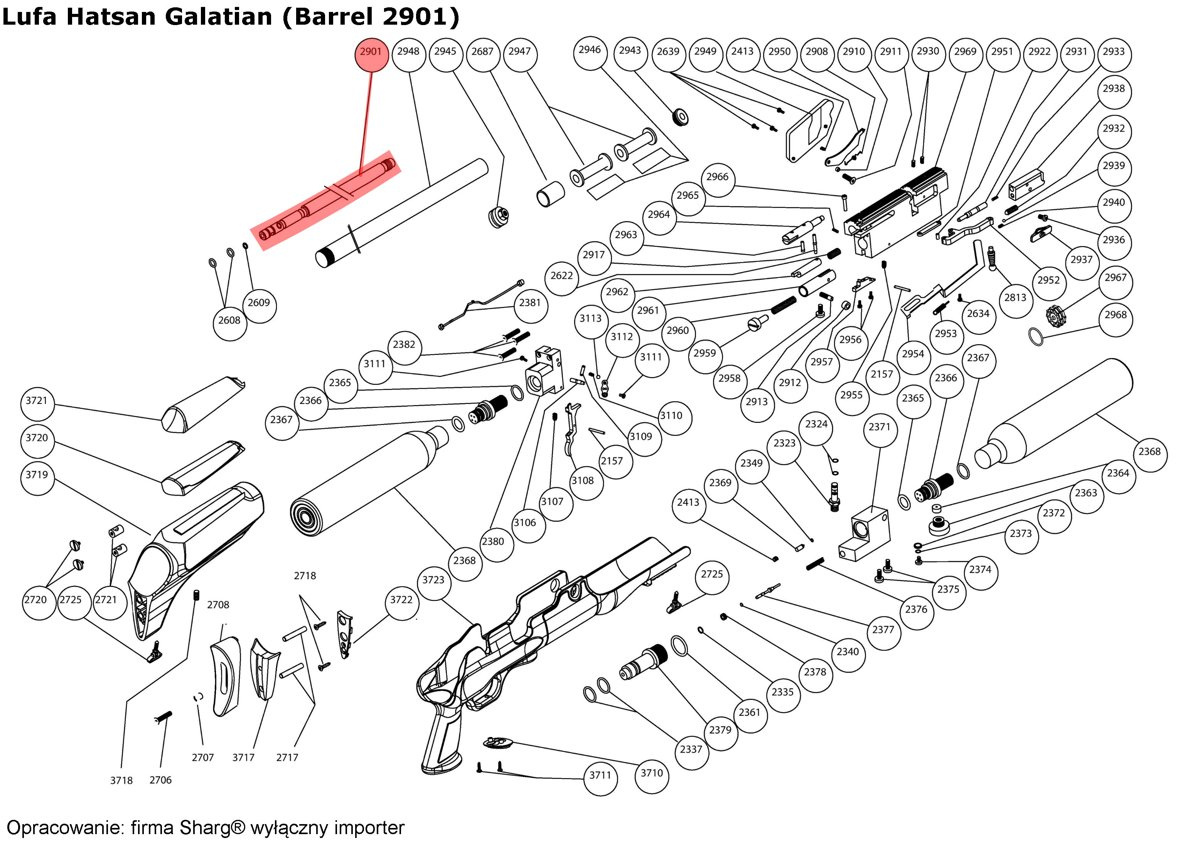 - 2901 - (serwis) precyzyjna gwintowana lufa o długości 23" (585 mm) firmy Hatsan Arms. Przeznaczona do mocnych wiatrówek PCP Predator, Hercules oraz Galatian. Lufy: 2901-1 kaliber .177 (4.5 mm), 2901-2 kaliber .22 (5.5 mm), 2901-3 kaliber .25 (6.35mm).