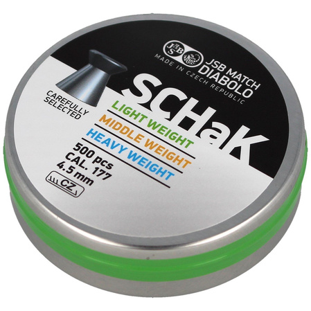 SCHaK - seria śrutów oferowana w tych samych kategoriach wagowych co Diabolo Match: lekkiej (0.475 / 0.500 g), średniej (0.520 g) oraz ciężkiej (0.535 g). Opakowania można łatwo rozróżnić po kolorze taśmy: green = light weight, yellow = middle weight, blue = heavy weight. Jedyną różnicą w stosunku do śrutów serii Match, jest szybszy proces kontroli jakości, dzięki czemu śrut SCHaK może być oferowany w znacznie niższej cenie. Precyzyjny śrut o stabilnej trajektorii lotu, idealny do strzelania tarczowego, amatorskiego oraz treningu. Wykonany z maksymalnie możliwą dokładnością wymiarową oraz wagową. Przeznaczony do strzelania do celów na dystansie 10 m.