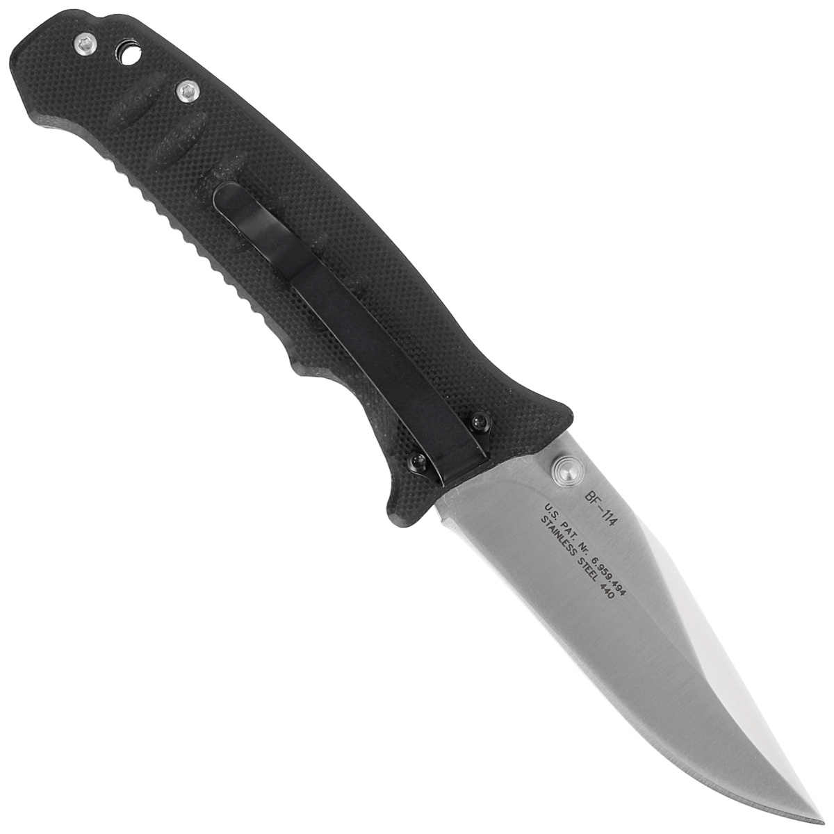 • BF-114 półautomatyczny taktyczny nóż BlackFox. Wyposażony w system szybkiego otwarcia Assisted Opening System, otwiera się po lekkim wypchnięciu głowni. Niska waga, sprężyna wspomagająca otwarcie, rękojeść G10, etui i doskonała cena to mocne atuty foldera