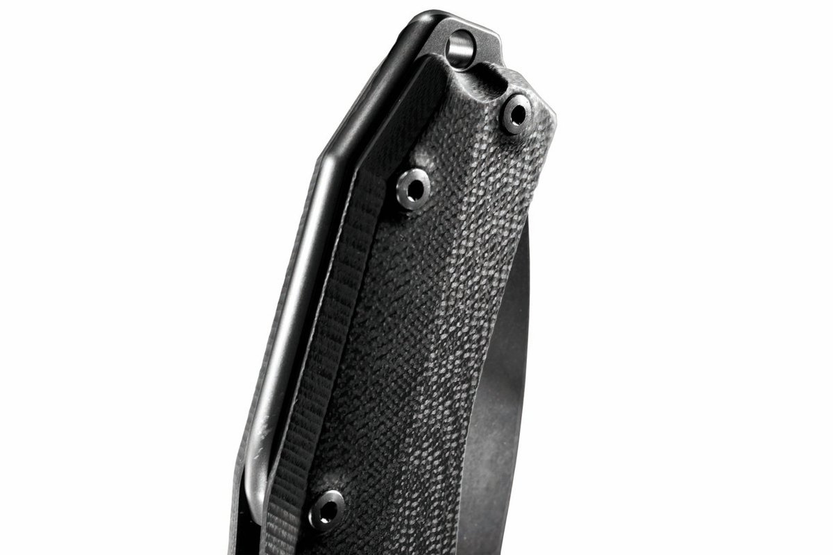 Rękojeść - oparto na stalowych linersach i backspacerze z tytanu 6AI4V, co zapewnia wysoką sztywność i odporność mechaniczną. Na konstrukcję nałożono frezowane okładziny z kompozytu G10, które dzięki trójwymiarowemu profilowi zwiększają komfort i przyczepność – także w wilgotnych warunkach. Wyraźne podcięcia pod palce i zaokrąglone krawędzie sprzyjają długotrwałemu użytkowaniu. Zastosowany klips typu wire deep carry umożliwia dyskretne przenoszenie w kieszeni, a lanyard hole i wystający fragment backspacera mogą służyć jako zbijak awaryjny. Całość tworzy ergonomiczny i niezawodny folder, zaprojektowany z myślą o pełnym komforcie i funkcjonalności w codziennym EDC.