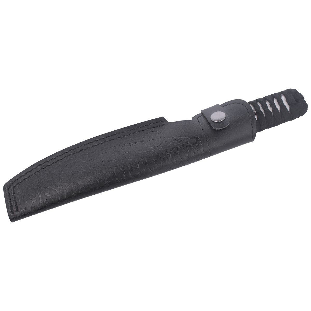Pochwa - przedłużana, chroni ostrze wraz z częścią rękojeści. Zapinana na zatrzask typu Prym dobrze zabezpiecza nóż przed wypadnięciem. Wykonana z naturalnej skóry, ozdobiona tłoczeniami w orientalnym wzorze.