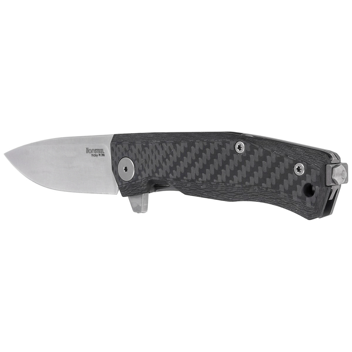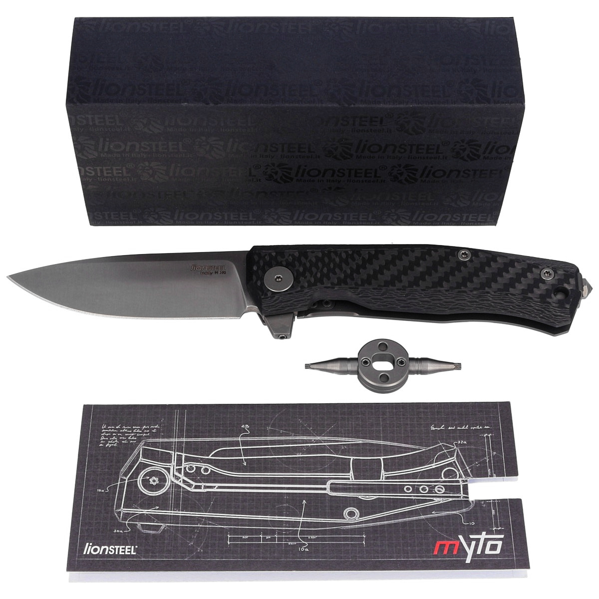 Myto Carbon Fiber, Satin zaawansowany technicznie folder Hi-Tech z wytrzymałą blokadą frame-lock. Wyjątkowy nóż E.D.C. włoskiej manufaktury LionSteel. Wyposażony w ostrze ze stali spiekanej M390, umieszczony na spodzie głowni „ReF”, system łożysk kulkowych Double Crown oraz tytanowy klips. W zestawie LionSteel Hand (#HY 68), klucz do regulacji śrub Torx T6, Torx 8 wraz z sześciokątnym kluczem Hex do śruby zbijaka szyb.