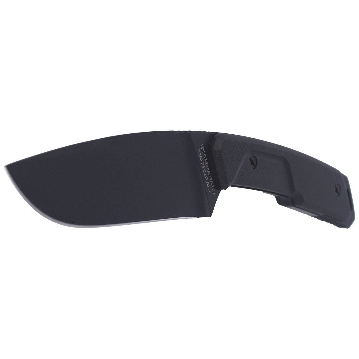 Głownia - to klasyczny drop point, tworzący w górnej części lekki łuk razem z rękojeścią. Taki kształt zapewnia doskonałą ergonomię pracy. Pełny płaski szlif to doskonałe cięcie, a 6.3 mm pocienione do 4mm grubości klingi daje zaś ponadprzeciętną wytrzymałość. W górnej części dodane zostało "fałszywe ostrze" dzięki któremu zyskujemy na precyzji przy pracach wymagających użycia czubka noża. Na grzbiecie klingi znajdziemy karbowanie pod palec zwiększające kontrolę nad ostrzem. Aby zapewnić większą twardość i odporność na korozję, ostrze zostało pokryte nowym produktem na bazie teflonu „EXP DARK”, zaproponowanym przez Extrema Ratio.