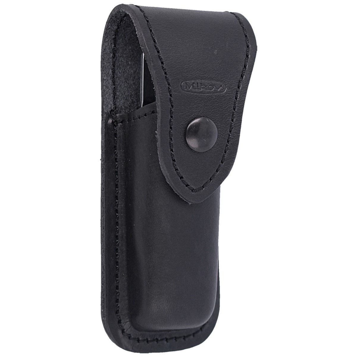 Etui - zapinane na zatrzask typu Prym. Wykonane z wysokiej jakości naturalnej skóry w kolorze czarnym z tłoczonym logo producenta. Pochwa posiada mocowanie do pasa lub oporządzenia umożliwiające przenoszenie noża w pozycji pionowej.