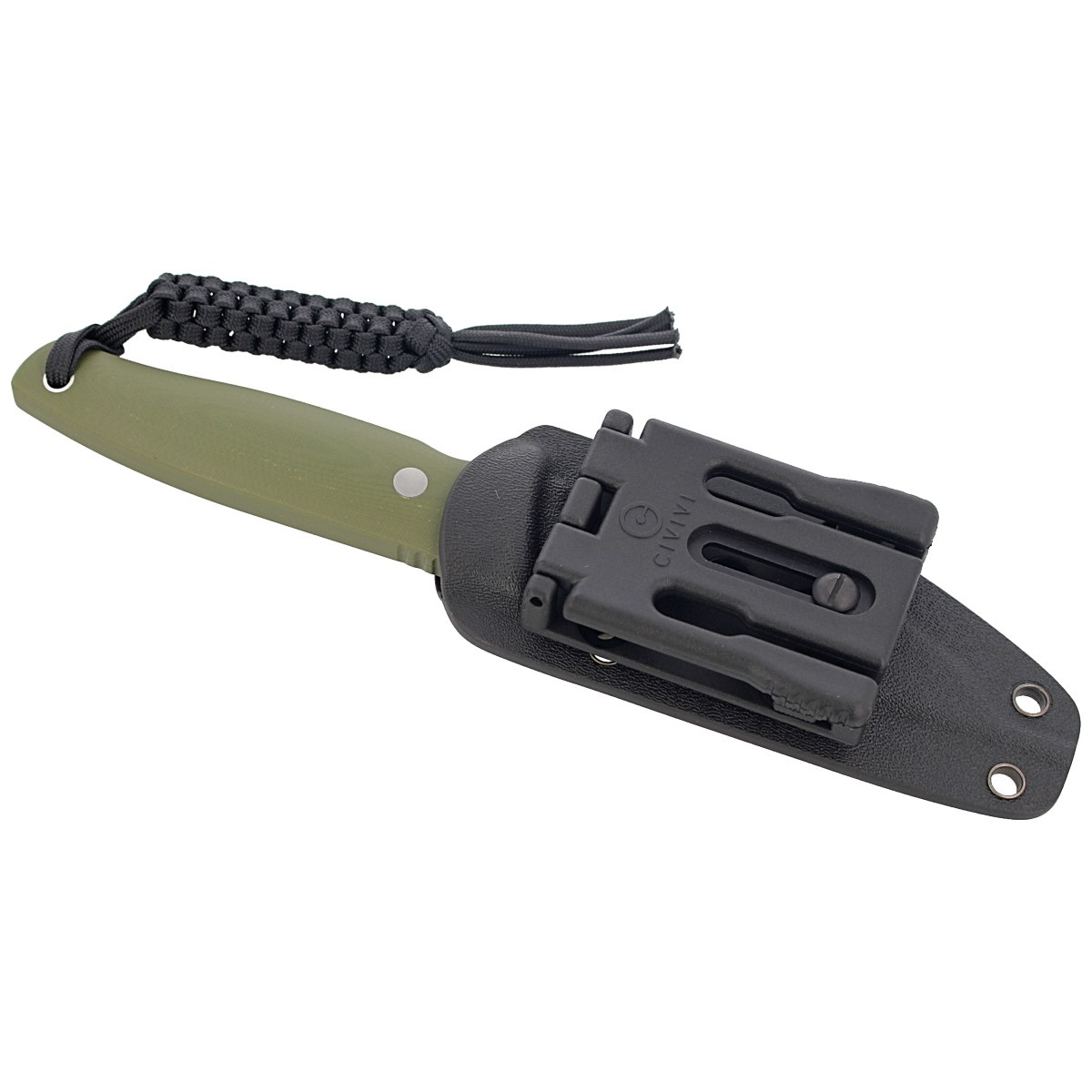 Rękojeść - okładziny o antypoślizgowej teksturze z kompozytu G10 w kolorze zielonymprzytwierdzone do tanga przy pomocy pinów. Prosta, solidna konstrukcja daje gwarancję wieloletniego użytkowania. W komplecie dostajemy czarną pochwe z kydexu którą dzięki montowanemu do niej klipsowi typu T (Tek-Lok) możemy niemal dowolnie mocować do paska czy oporządzenia. Przelotowy pin na tyle rękojeści tworzy lanyard hole, otwór do przewleczenia linki zabezpieczającej lub ozdobnej (w komplecie).