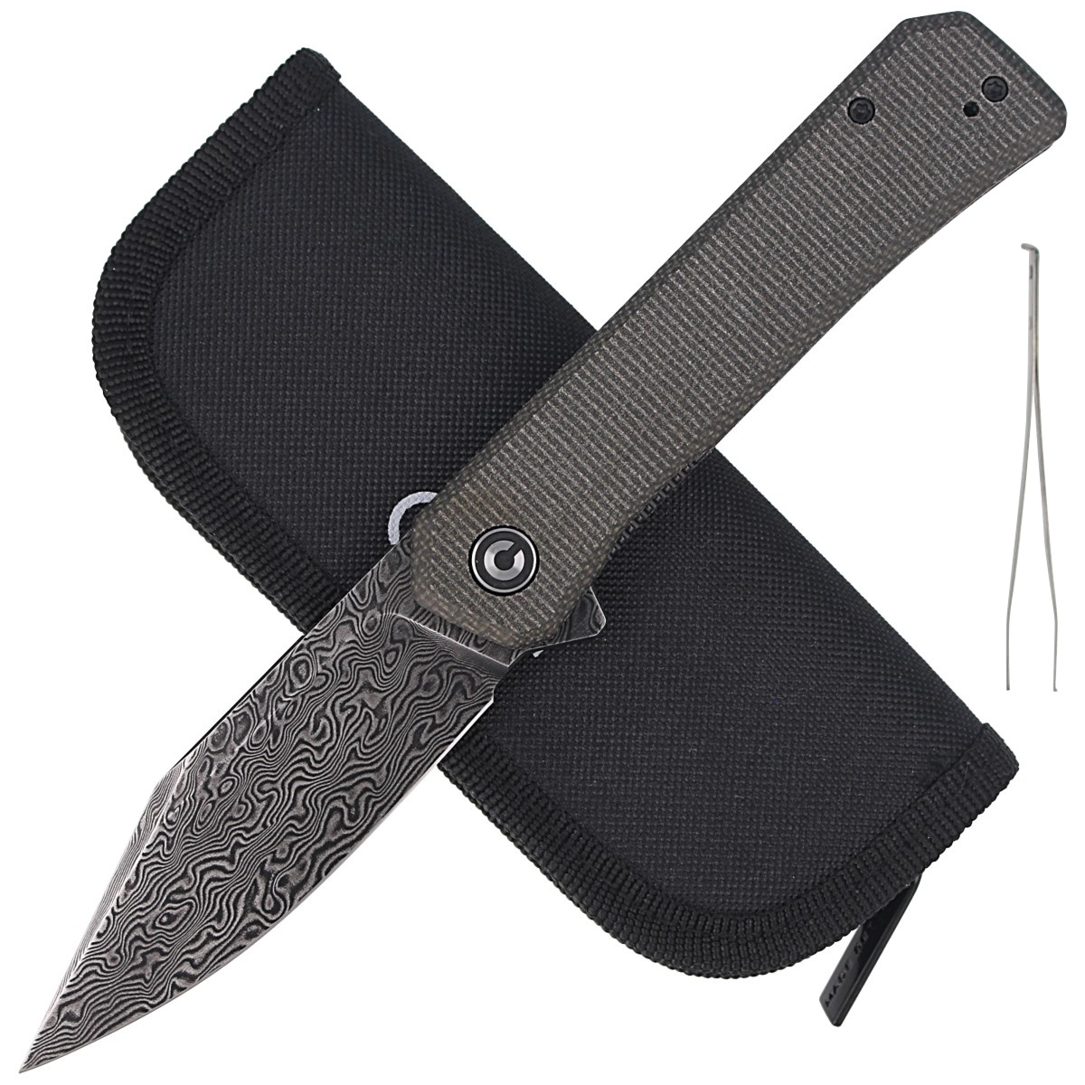 - Relic Dark Green Micarta, Black Damascus kunsztowny folder EDC z szeroką zakończoną ostrym jak igła sztychem klingą z czarnego damastu. Otwierany szybką płetwą Flippera. Okładziny z micarty z ukrytą w tylnej części rękojeści pęsetą. Bestseller!