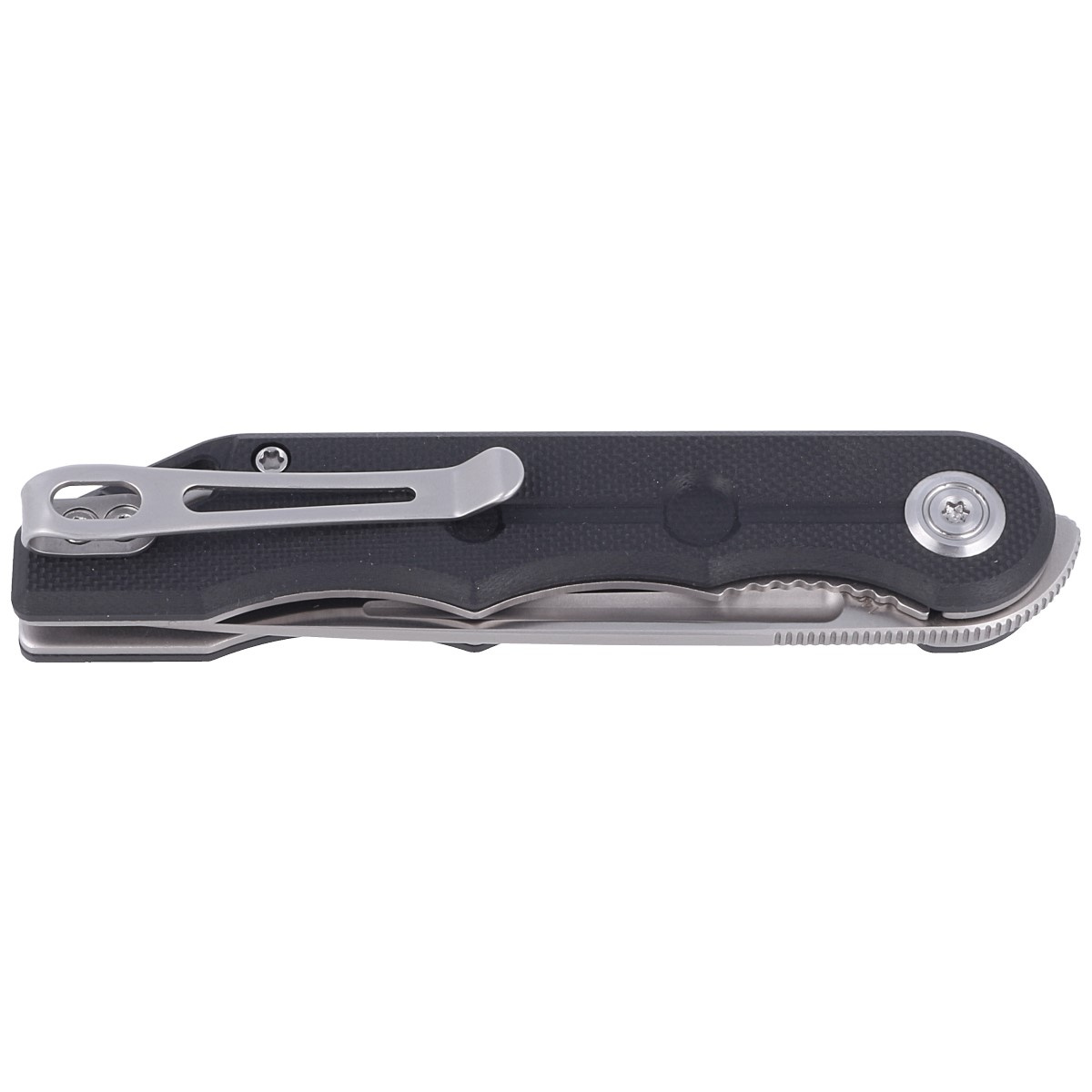 Rękojeść - okładziny z czarnego G10 (włókno szklane prasowane pod ciśnieniem z syntetyczną żywicą),teksturowane dla poprawienia pewności uchwytu, przykręcono do stalowej ramy noża. Otwarta konstrukcja tzw. open-backed bez typowego backspacera, mocowana do siebie stalowymi tulejami dystansowymi ułatwia czyszczenie.. Prosta, solidna konstrukcja daje pewność wieloletniego użytkowania. Podcięcie na palec (fore finger groove) poprawia pewność uchwytu. Oś pivota zdobi stylizowane logo producenta. Dwupozycyjny (prawo i lewostronny) metalowy klips deep carry pozwala przenosić dyskretnie nóż w kieszeni w pozycji tip-up (czubkiem ostrza do góry). Nad klipsem lanyard hole, otwór do przewleczenia linki zabezpieczającej lub ozdobnej.