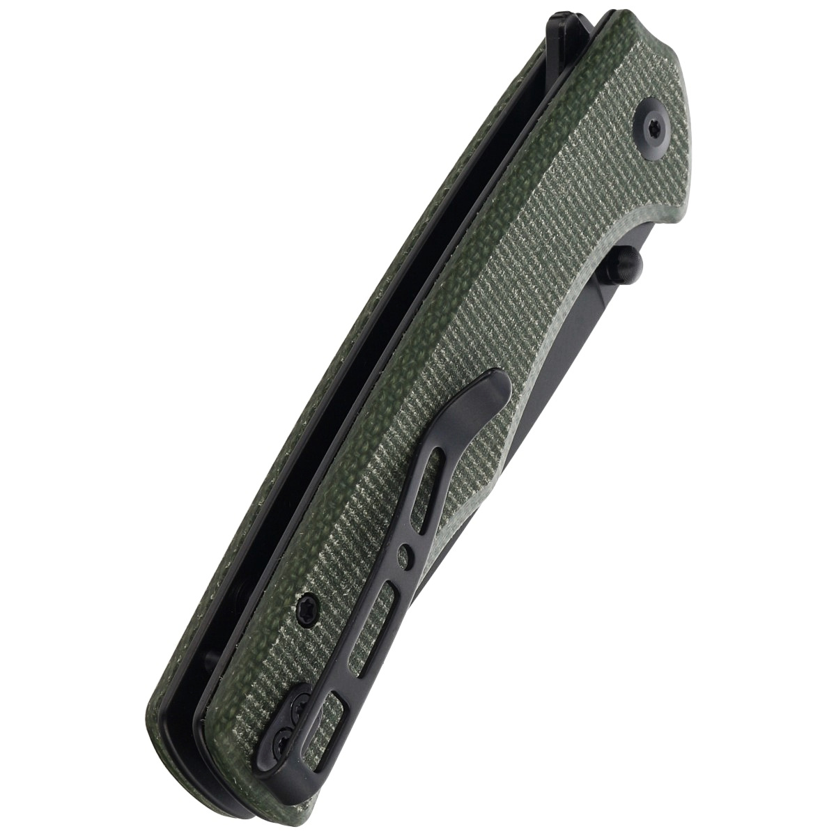 Rękojeść - w zielonym kolorze. Wykonana z Micarty, kompozytowego materiału z płótna prasowanego pod ciśnieniem z syntetyczną żywicą. Fazowane krawędzie okładek eliminują ostre krawędzie dla wygody, uchwytu. Otwarta konstrukcja tzw. open-backed mocowana stalowymi tulejami dystansowymi redukuję wagę oraz ułatwia czyszczenie. Dwupozycyjny, prawo/lewostronny klips deep carry pozwala przenosić dyskretnie nóż w kieszeni w pozycji tip-up (czubkiem ostrza ku górze).
