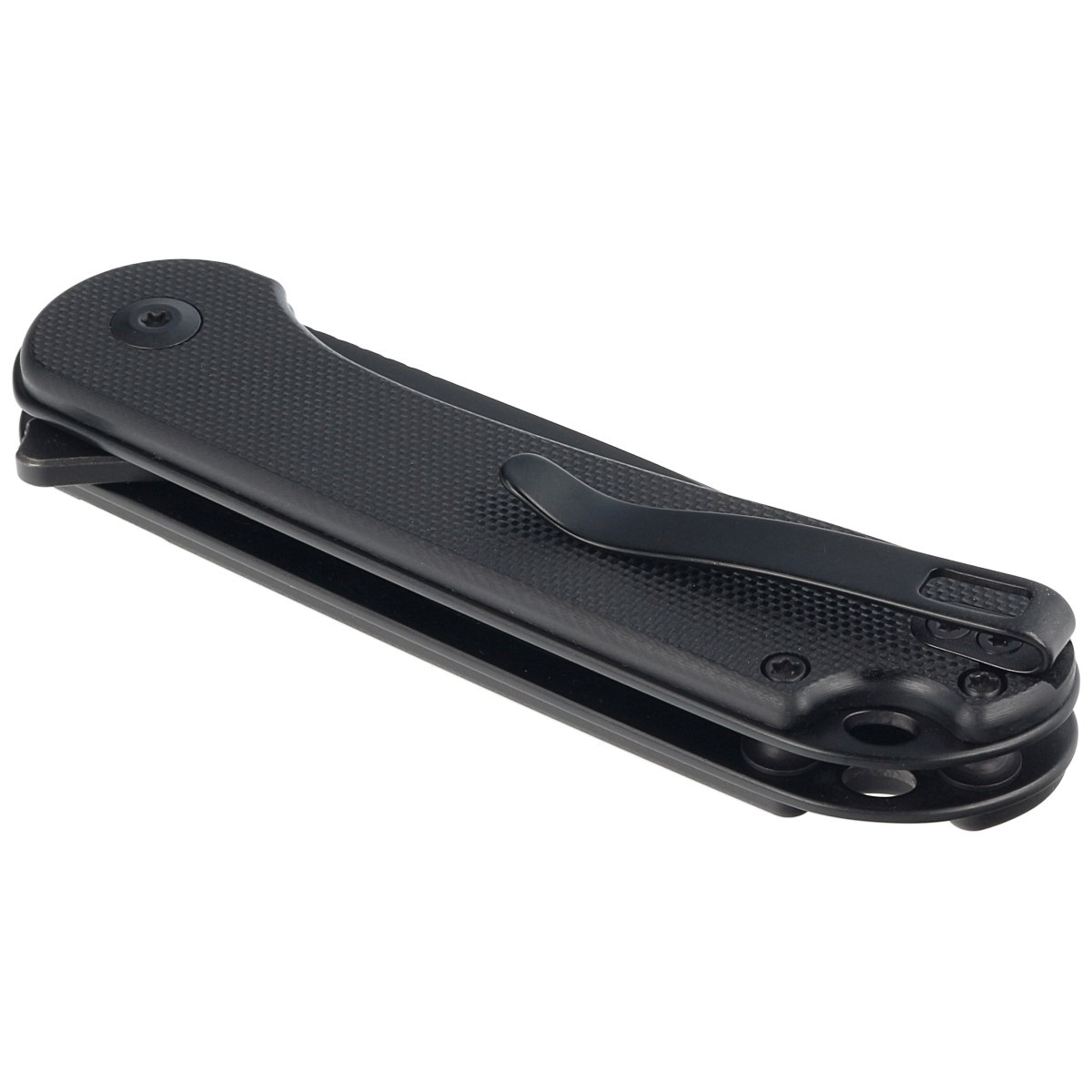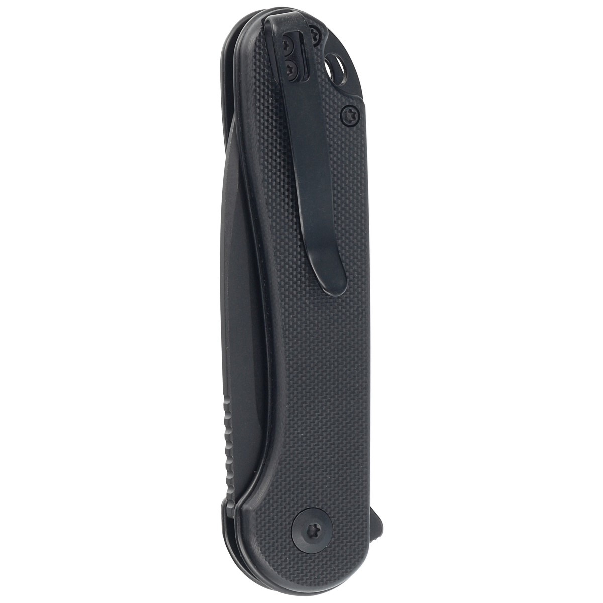 Rękojeść - teksturowane okładki w czarnym kolorze z G10, kompozytowego materiału z włókna szklanego i żywicy syntetycznej. Całość mocowana do linersów ze stali nierdzewnej. Prosta, solidna konstrukcja daje pewność wieloletniego użytkowania. Otwarta konstrukcja tzw. open-backed mocowana stalowymi tulejami dystansowymi redukuję wagę oraz ułatwia czyszczenie. Oś pivota zdobi stylizowane logo marki Civivi. Metalowy jednostronny (prawa) klips deep carry pozwala przenosić dyskretnie nóż w kieszeni w pozycji tip-up (czubkiem ostrza do góry).