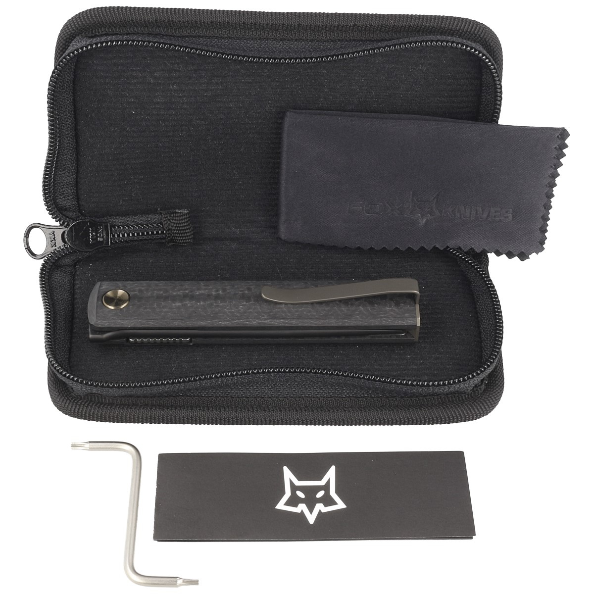 Chnops Black Carbon Fiber, Black PVD to smukły nóż typu gentlemans folder. Piękne okładziny z włókna węglowego, tytanowy klips, backspacer oraz śruby, ostrze z doskonałej stali M390 pokrytej dodatkowo czarną powłoką PVD. Doskonały wybór na EDC! Zaprojektowany dla firmy Fox Cutlery przez Riccardo Gobbato, włoskiego designera i knifemakera.