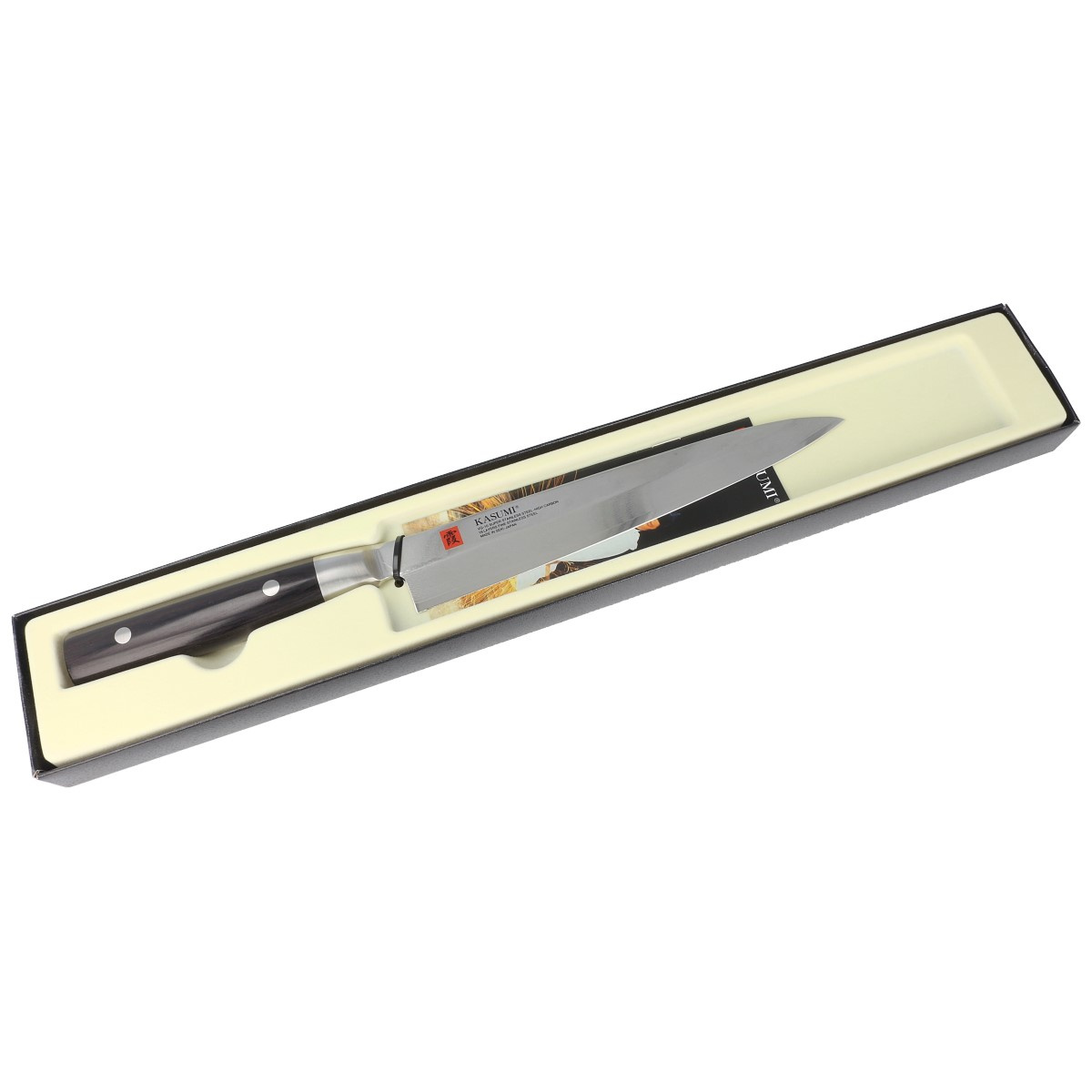 Kasumi Damascus Sashimi 21 z rdzeniem ze stali nierdzewnej VG-10 wykończony 32 warstwowym damastem. Wykonany tymi samymi metodami co miecze samurajskie, z wygodną, europejską rękojeścią z drewna pakka. Uwaga!!! Bardzo ostre!!! W 2002 roku noże "KASUMI" zdobyły nagrodę Design Plus Award na targach Ambiente Messe w Niemczech.