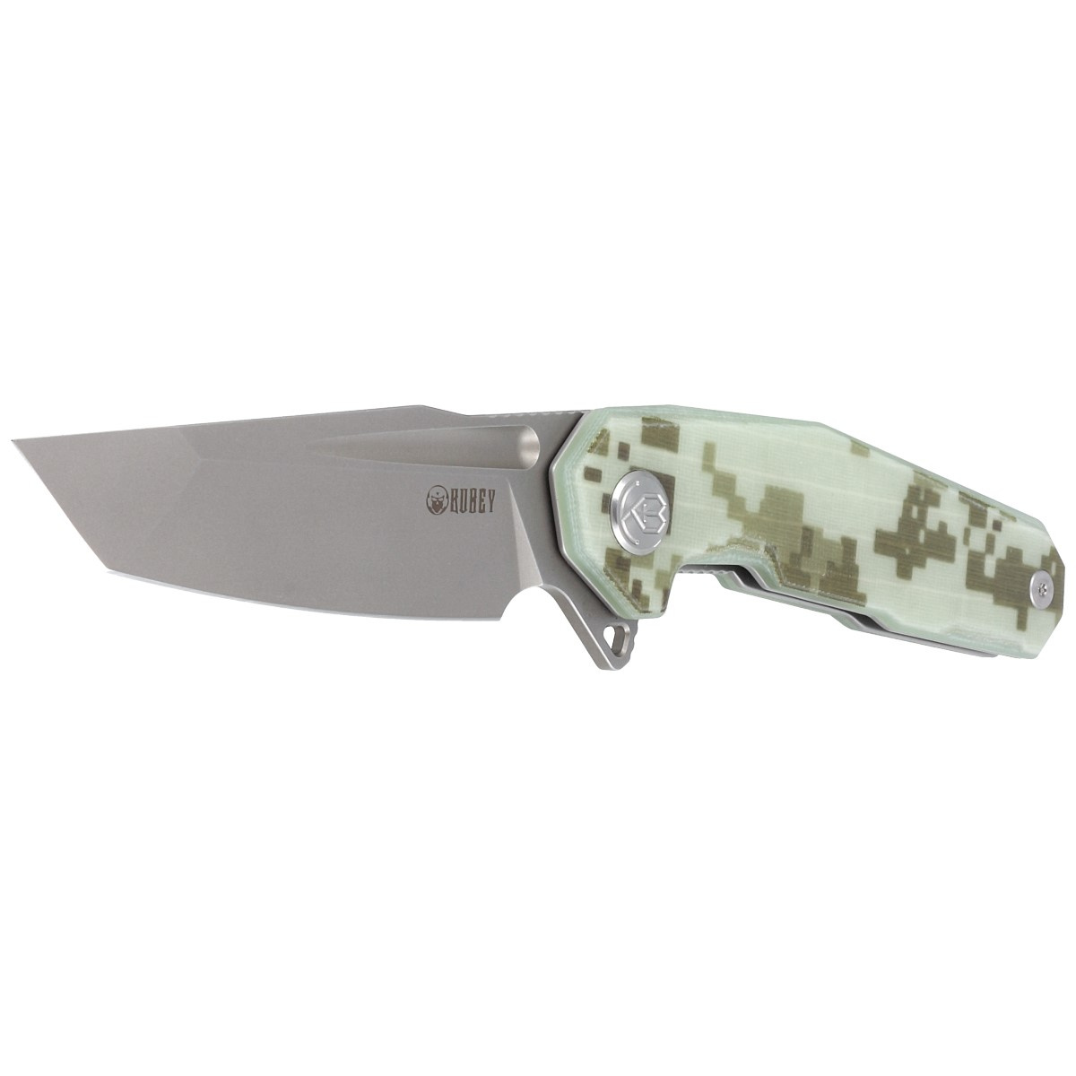 Rękojeść - okładziny w pikselowym, militarnym, cyfrowym kamuflażu. Wykonane z kompozytu G10 (włókno szklane prasowane pod ciśnieniem z syntetyczną żywicą), teksturowane dla lepszego chwytu, przykręcone do stalowej ramy noża. Otwarta konstrukcja tzw. open-backed mocowana do siebie stalowymi tulejami dystansowymi zmniejsza wagę oraz ułatwia czyszczenie. Prosta, solidna konstrukcja daje pewność wieloletniego użytkowania. Głębokie, profilowane podcięcie na palec (fore finger groove) poprawia pewność uchwytu. Oś pivota zdobi stylizowane logo marki Kubey Knife. Jednopozycyjny (prawostronny) metalowy klips deep carry pozwala przenosić dyskretnie nóż w kieszeni w pozycji tip-up (czubkiem ostrza do góry).