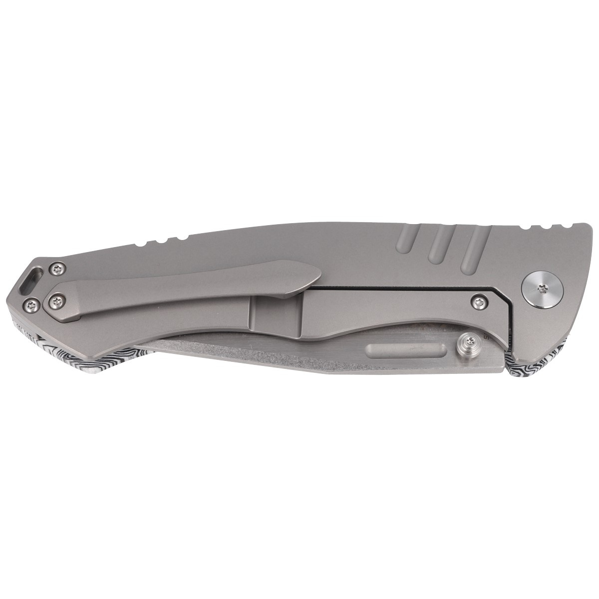 Rękojeść - strona reprezentacyjna wykonana z Damascus G10 o niepowtarzalnym wzorze, strona blokady z litego tytanu 6AL4V. Fazowane krawędzie okładek eliminują ostre ranty dla wygody i poprawiają pewność uchwytu. Masywny tytanowy backspacer do którego przymocowano okładziny gwarantuje sztywność i wytrzymałość całej konstrukcji. Fragment grzbietu rękojeści pokryto upper jimping, karbowanym oparciem pod kciuk ułatwiającym kontrolę nad nożem. Jednopozycyjny, prawostronny tytanowy klips umożliwia przenoszenie noża w pozycji tip-up, czubkiem ostrza ku górze.